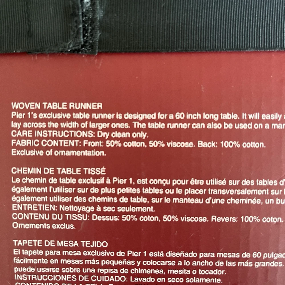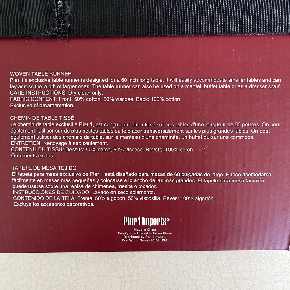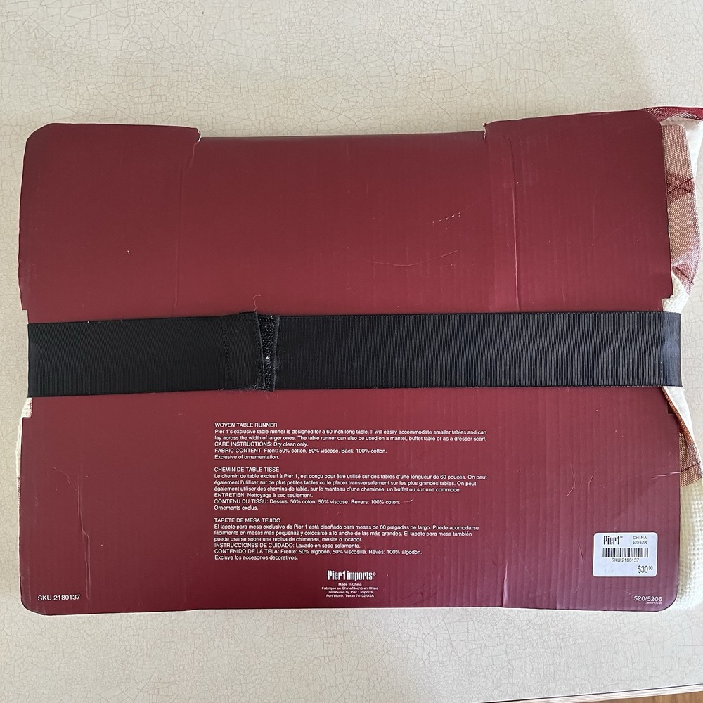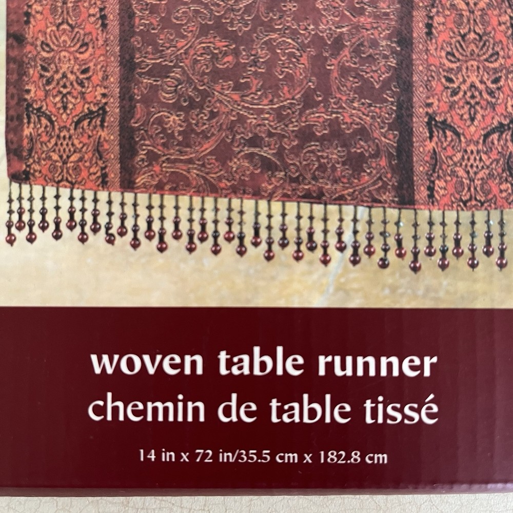 PIER ONE WOVEN TABLE RUNNER NEW WITH TAGS, OLDER STOCK RED/GOLD/CREAM COLOR BLOCK WOVEN DESIGN DRY CLEAN ONLY FOR A 60 " LONG TABLE 50 COTTON 50 VISCOSE MATERIAL, ON THE BACK, 100 COTTON FROM A PET AND SMOKE FREE HOME