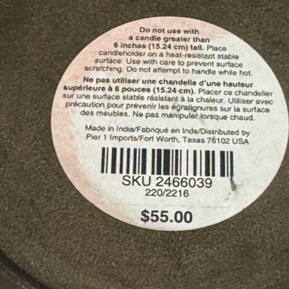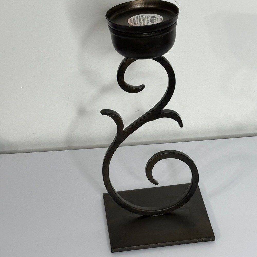 Hand forged metal finished antiqued bronze candle holder. H 9.5” X W 4.5” X D 4”...