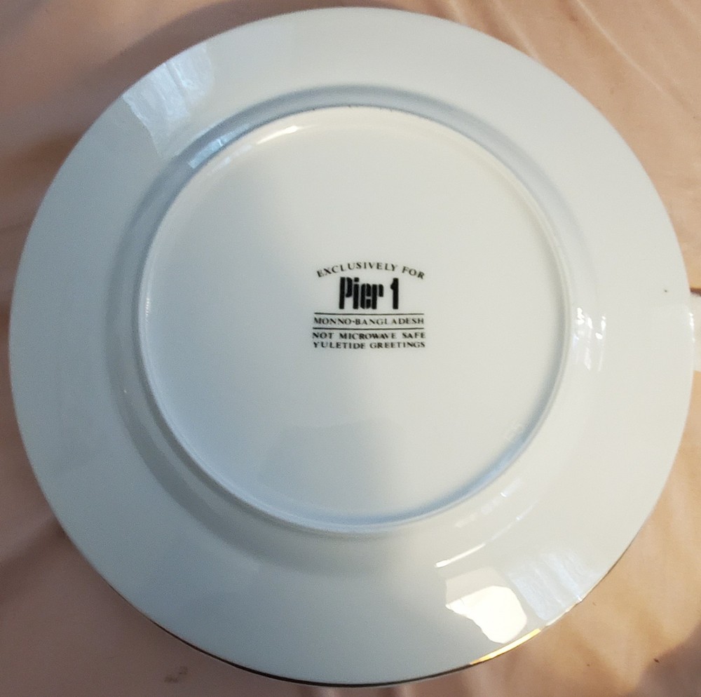 The Pier 1 YULETIDE GREETINGS Set of 4 Dessert Plates. Yuletide Greetings pattern in gold, red, and green....