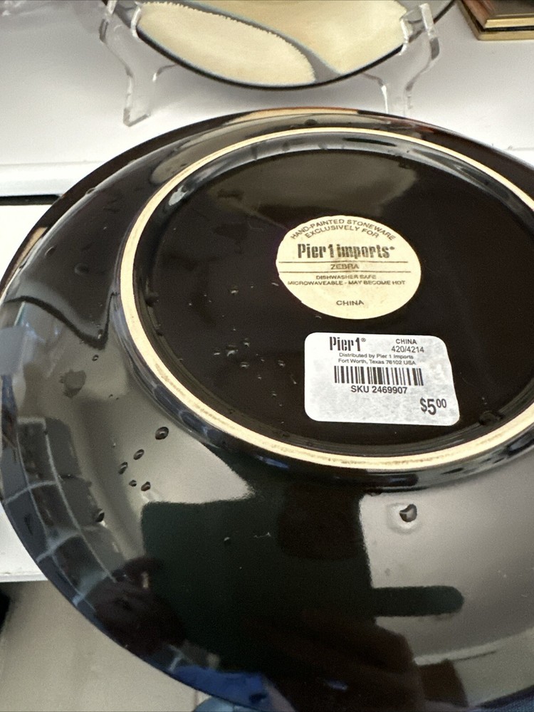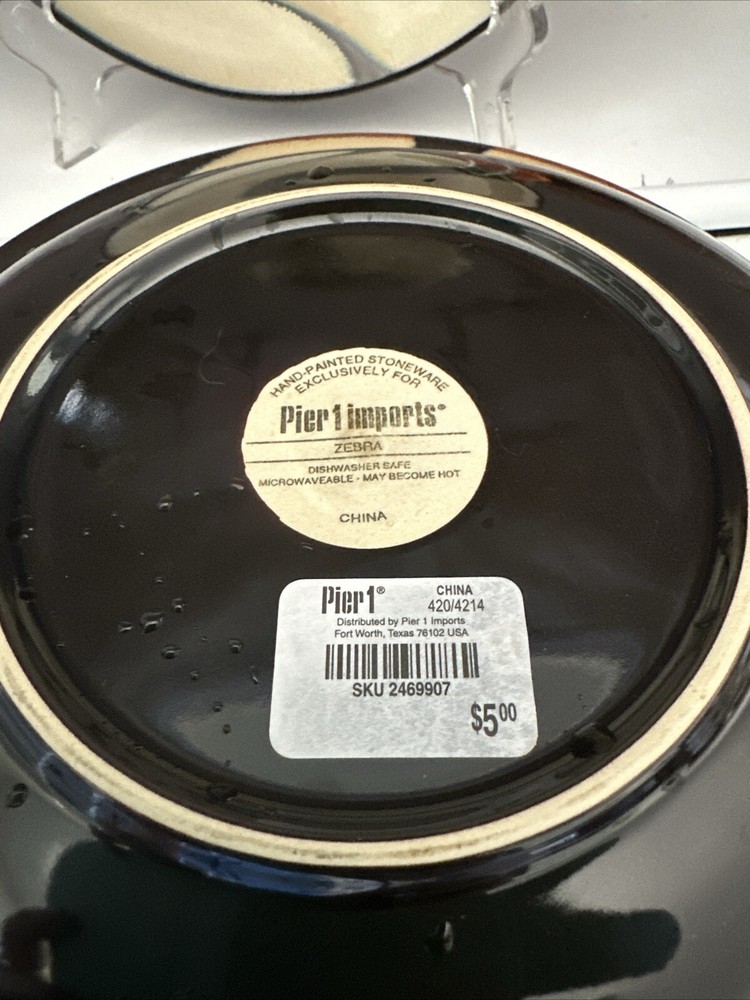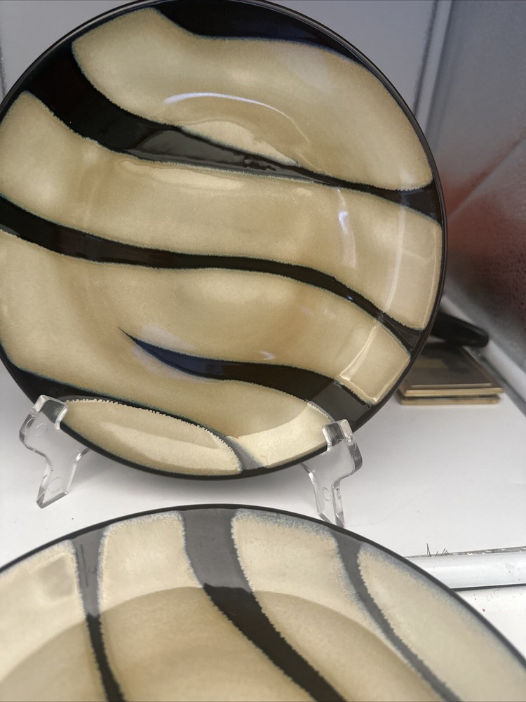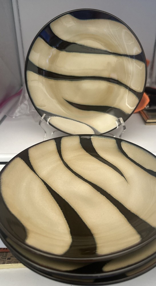 Add a touch of elegance to your dining table with this set of four Pier 1 salad plates. The plates feature a beautiful zebra pattern in tan and brown, with round shapes and a diameter of 8 inches. Made of high-quality stoneware material, these plates are both dishwasher and microwave safe, making them perfect for everyday use or special occasions. Each plate bears a printed backstamp and weighs 3.8lbs. These original, handmade plates are produced using art pottery techniques in China, and their glossy finish adds a touch of sophistication to any table setting. Whether you're serving a delicious salad or hosting a dinner party, these plates are sure to impress your guests.