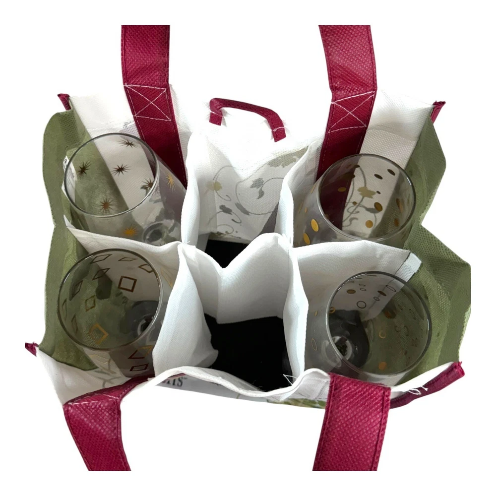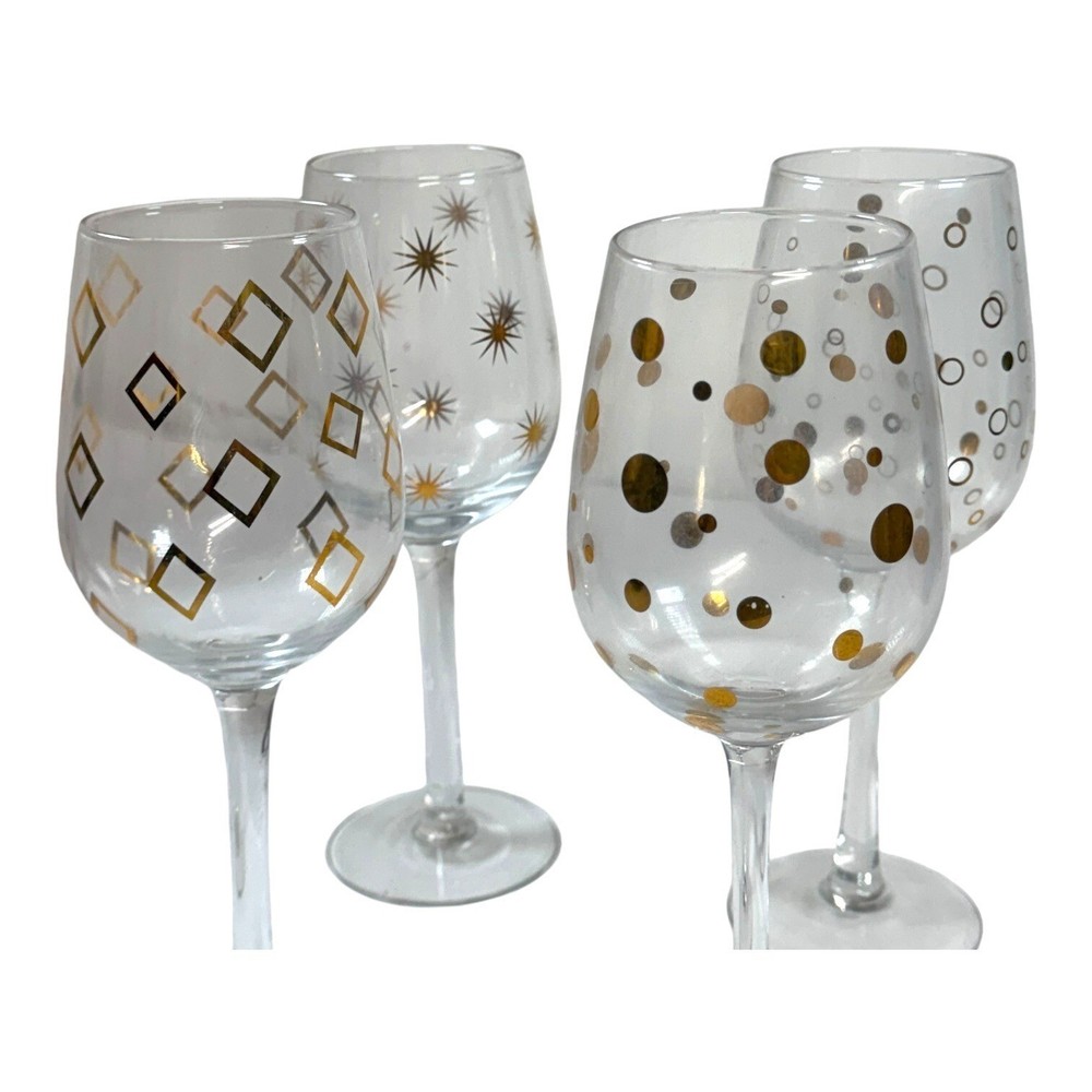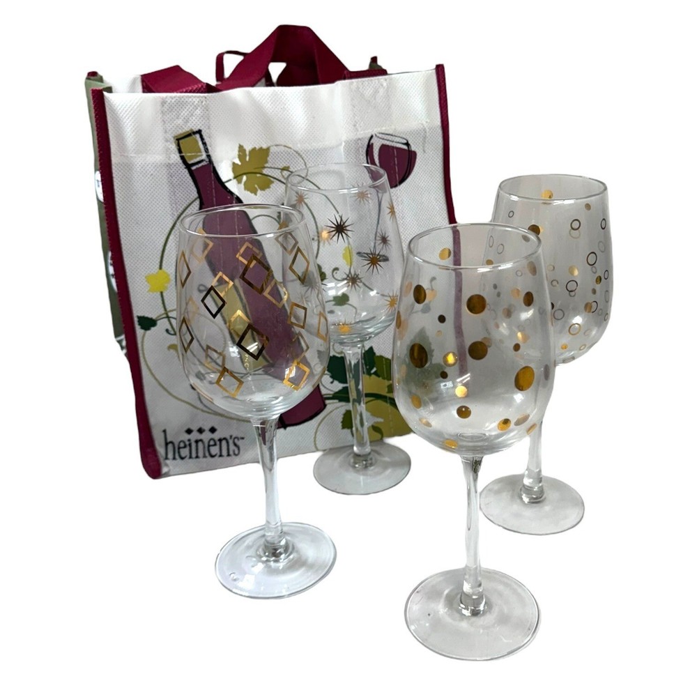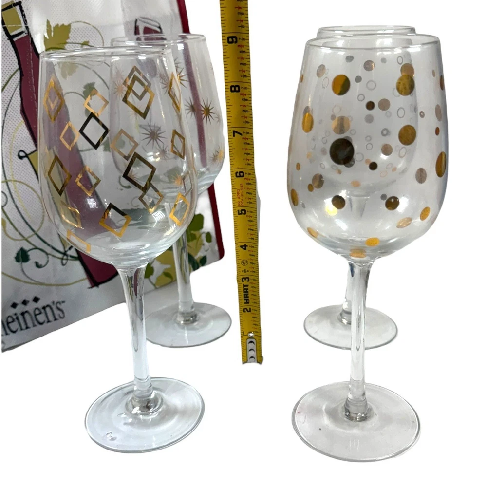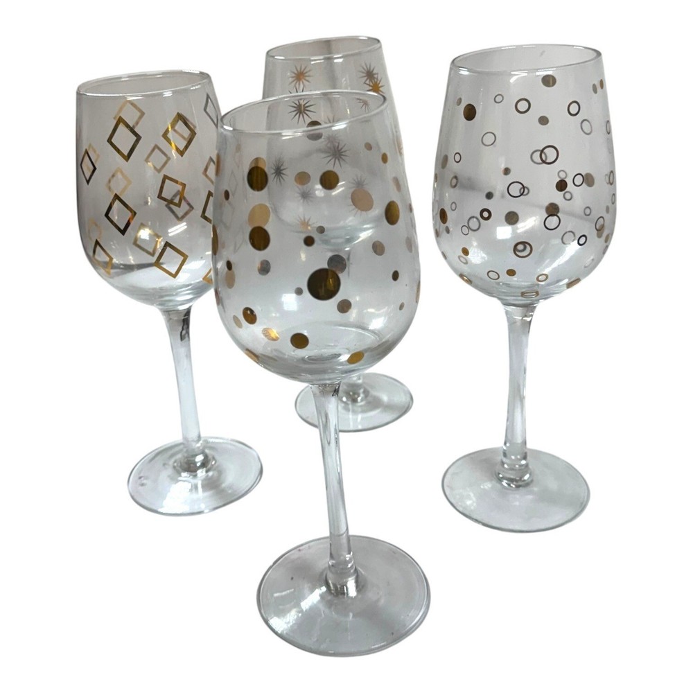 These wine glasses are so fancy, they make boxed wine taste like a vintage from 1892. Drink up and let the compliments pour in. • 4 wine glasses • Unique gold & silver patterns • Stemmed base design • Perfect for entertaining • Comes with a stylish carrying bag Height = 8 inches Condition: Pre-Owned Good