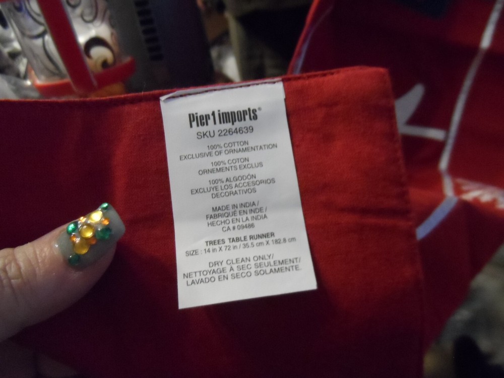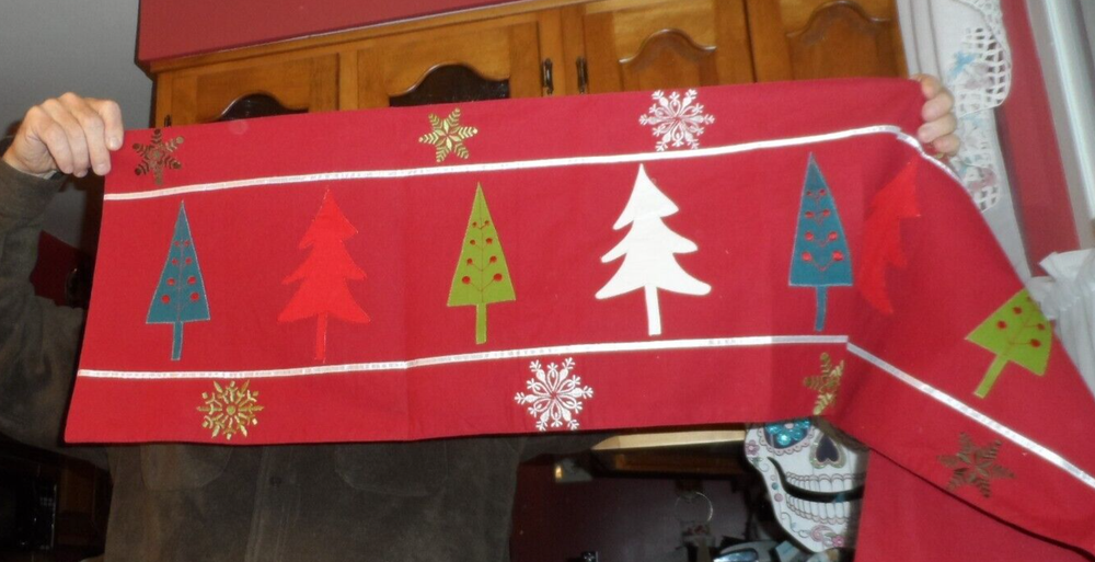 Pier 1 red Christmas table runner with tree & snowflake design 72" x 14 beautiful, designs have embroidered edges smoke free home. I am always happy to combine shipping. INternational shipping is additional