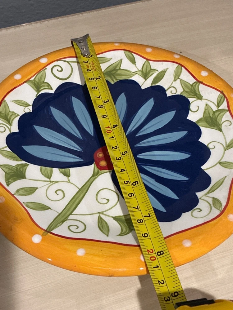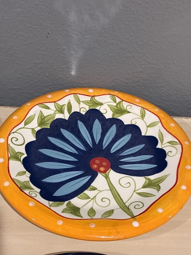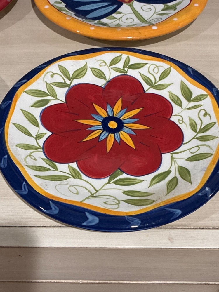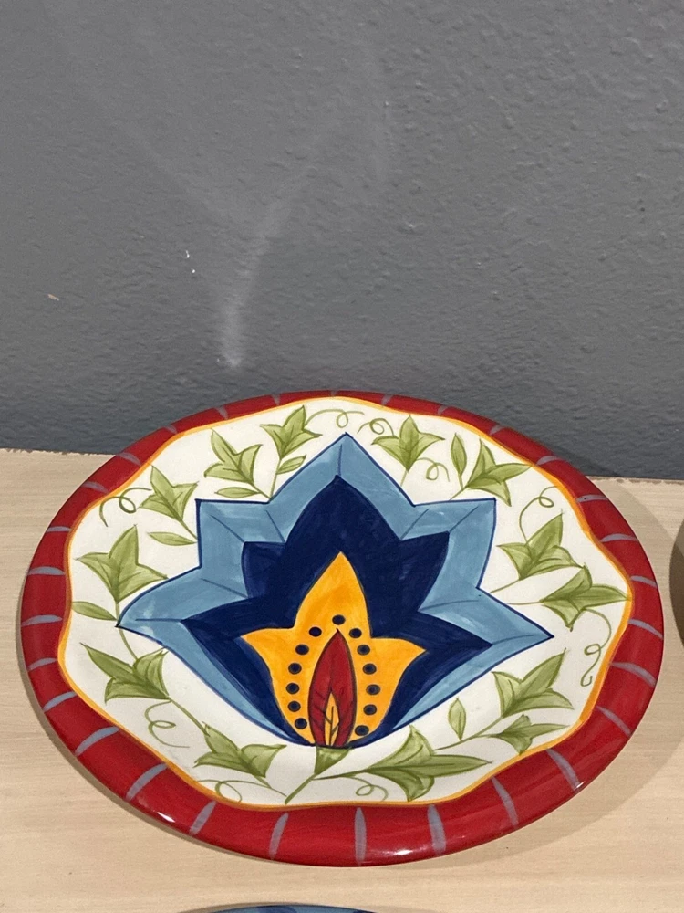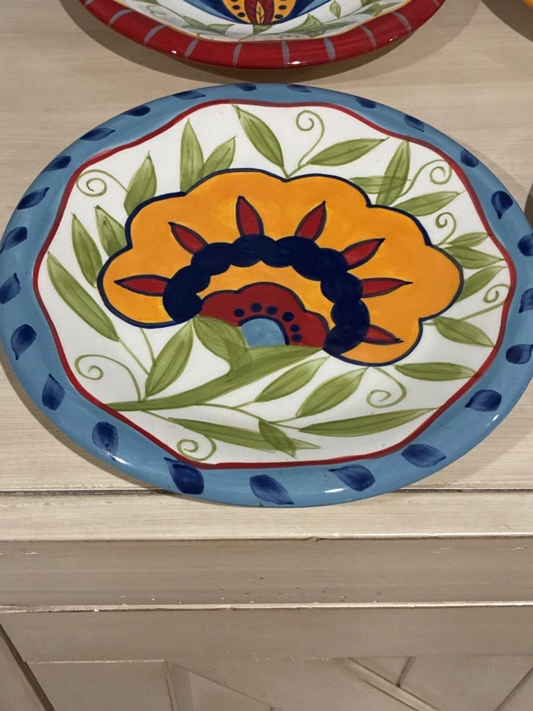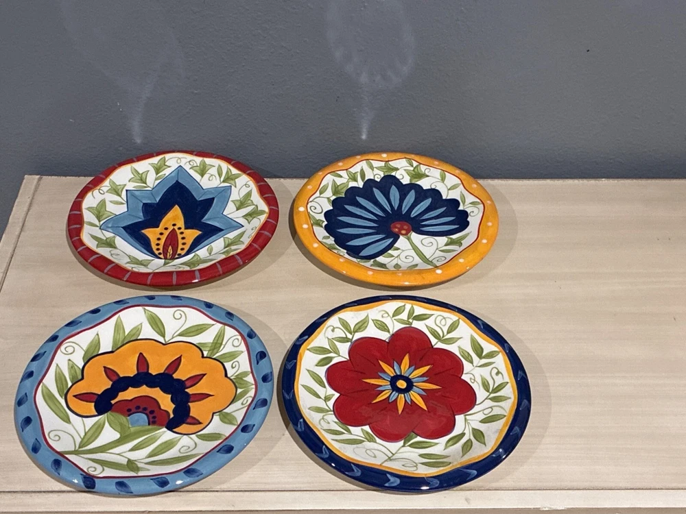 Add a touch of elegance to your dining with this set of four Pier 1 plates. Each 8 1/4" plate features a hand-painted floral design, perfect for both everyday use and special occasions. Hand painted Earthenware multicolor Flowers , Mexican Italian Spanish Style dishwasher and microwave safe • Set of four plates • 8 1/4" diameter • Hand-painted floral design • Durable and stylish • Ideal for dining and decor Features: • Floral Size: Unisex 8 1/4" Condition: Pre-Owned Good