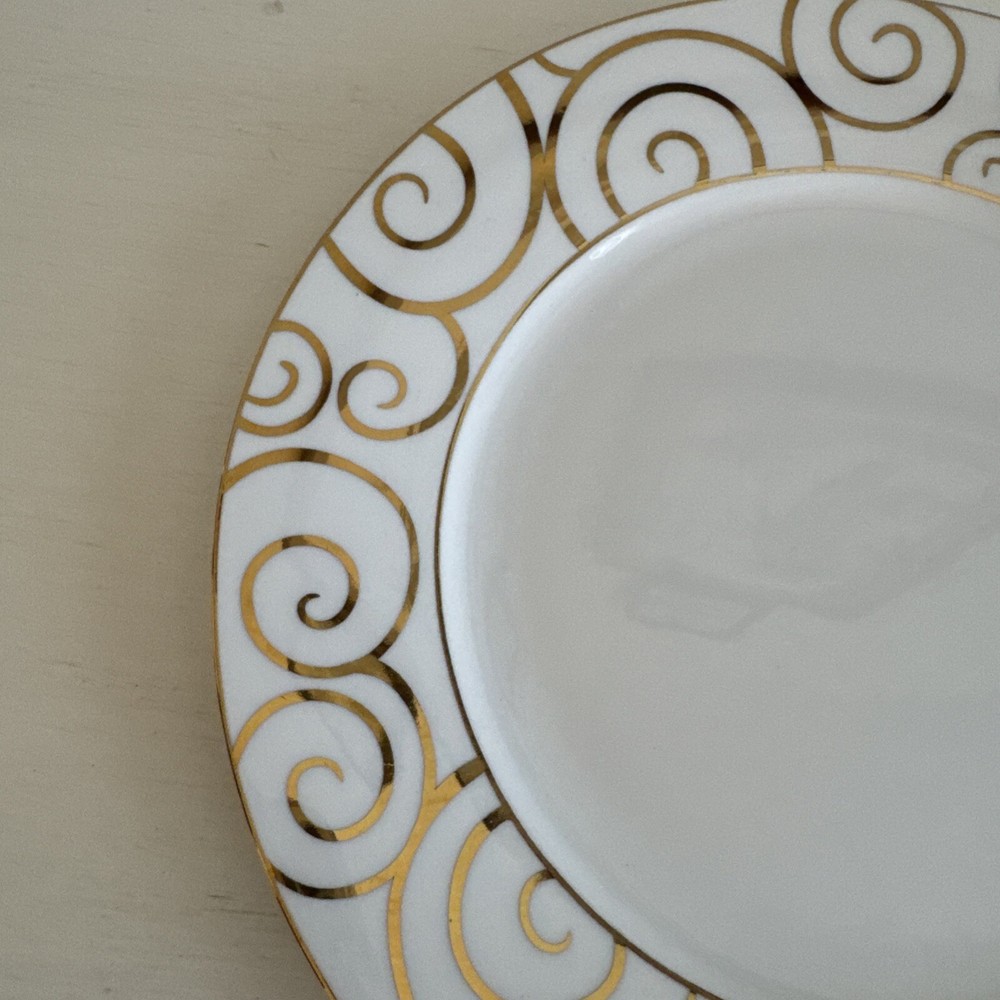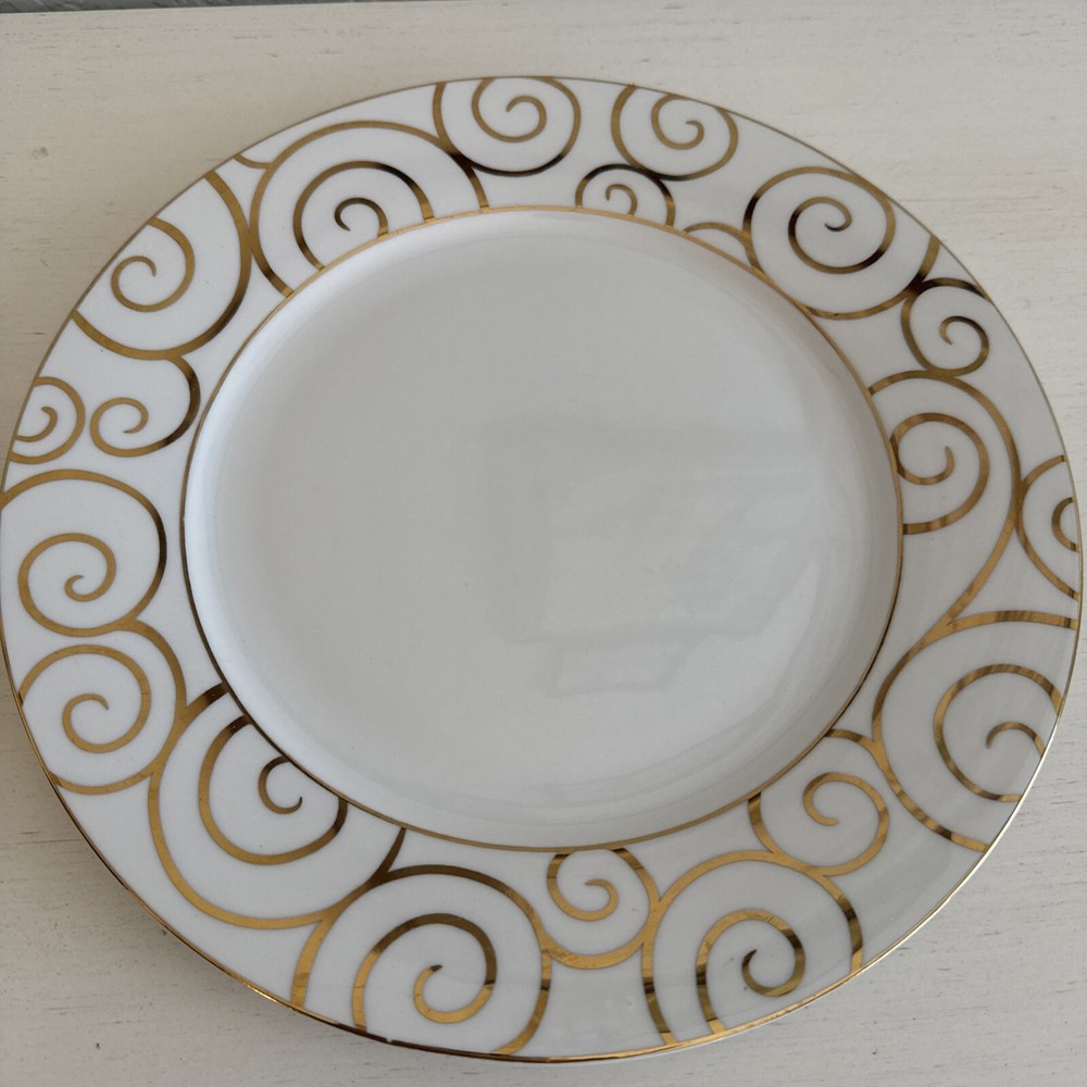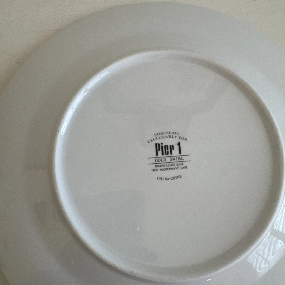 Replace or elevate your dining experience with the Pier 1 Gold Swirl Dinner Plate, a exquisite piece of porcelain that brings a touch of elegance to any table setting. The 10.25" diameter plate features a stunning swirl pattern in a rich gold hue, perfectly suited for special occasions or to add a luxurious element to your everyday meals. Crafted with care, this dinner plate hails from Pier 1's esteemed collection and showcases the fine art of pottery with a printed backstamp confirming its authenticity. Whether you're hosting a holiday dinner or serving a gourmet meal, this plate is a chic choice for those who appreciate the blending of sophistication and functionality.