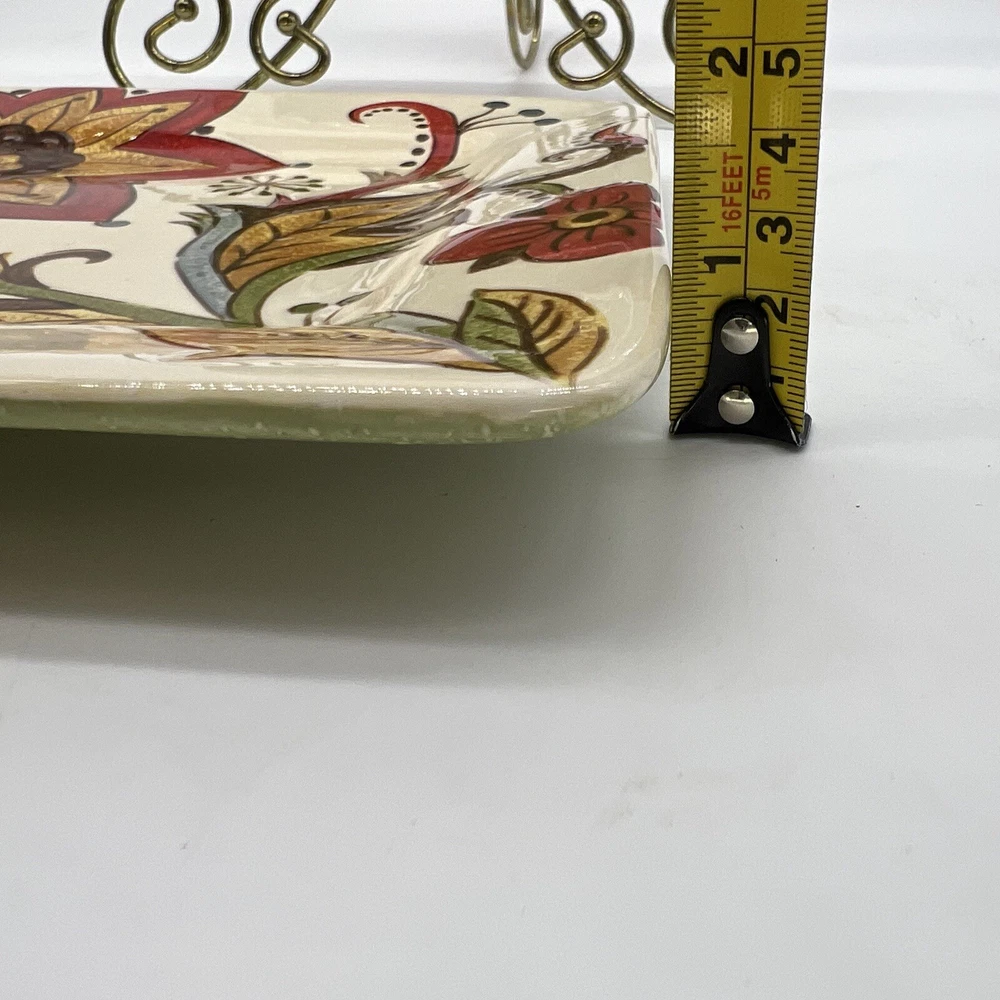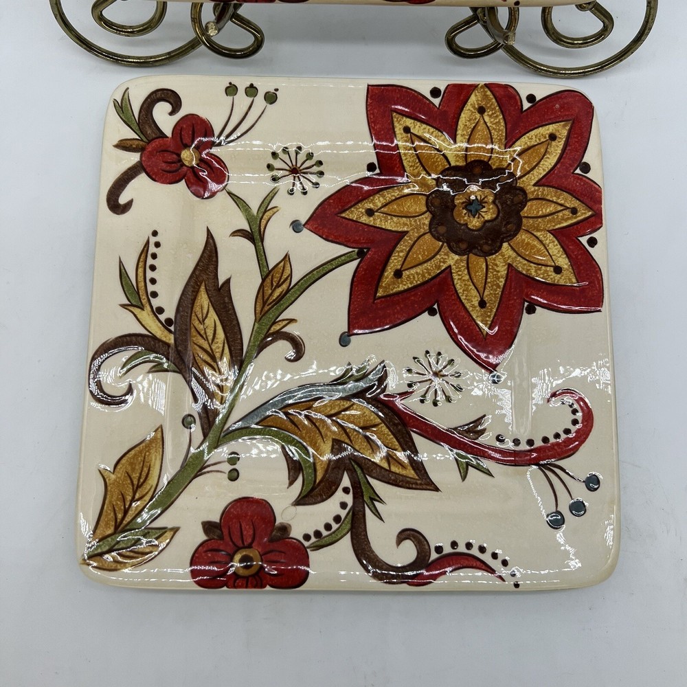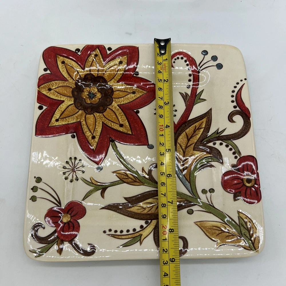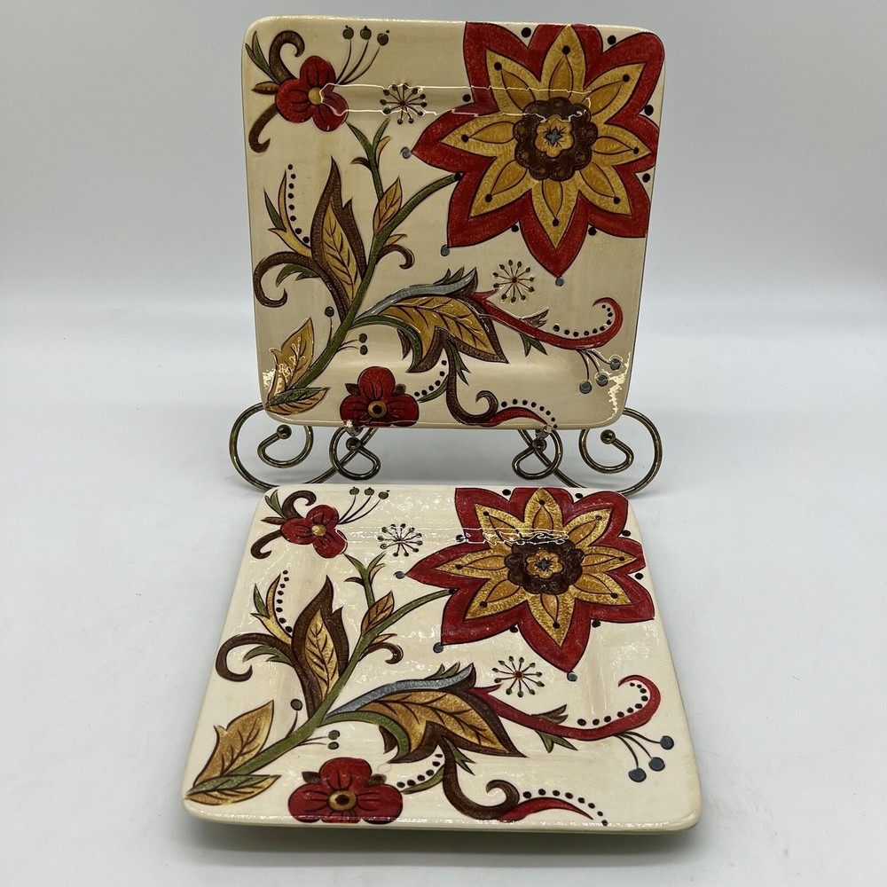 Add a touch of vintage charm to your dinnerware collection with this set of two square earthenware salad plates from Pier 1 Imports. Featuring a beautiful Carynthum pattern in multicolor, these plates are perfect for all occasions. The plates measure 8 3/4 inches and are made of high-quality earthenware material. These original studio-crafted plates are from the Pier 1 Imports product line and were produced in China using traditional earthenware techniques. The backstamp is printed and the plates are not handmade. Ideal for serving salads and other dishes, these plates are a must-have for any dinner party. See photos for size and condition.
