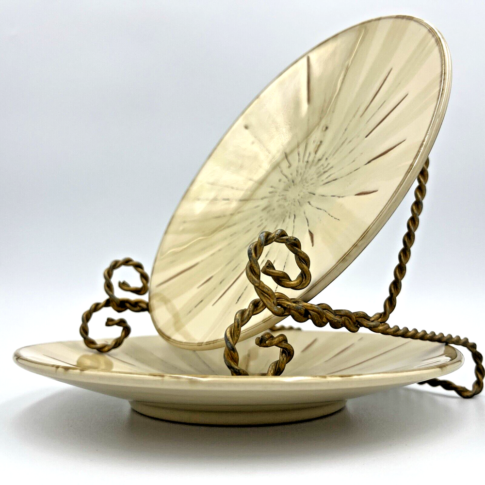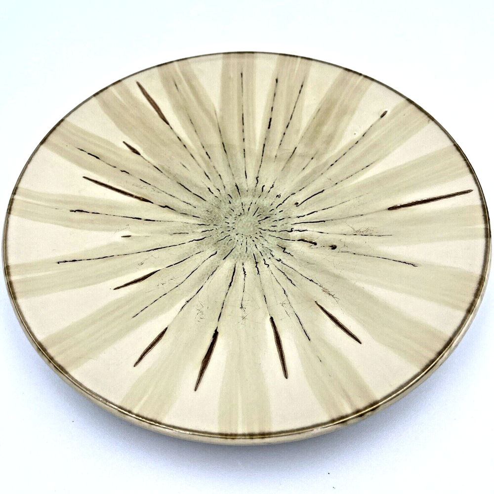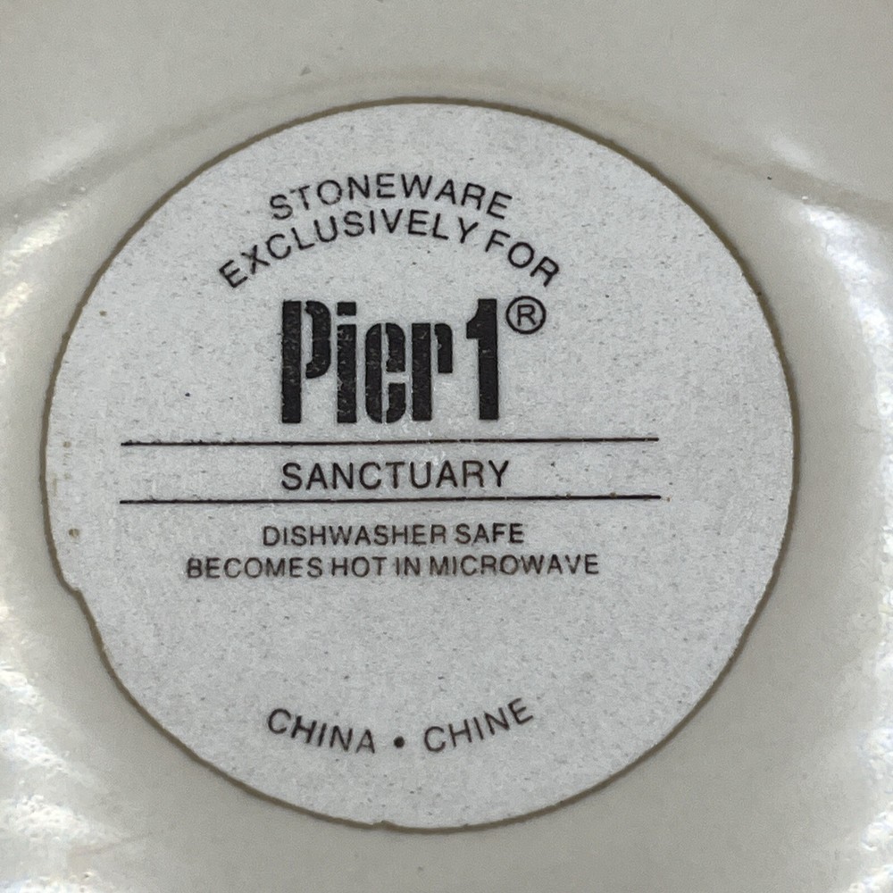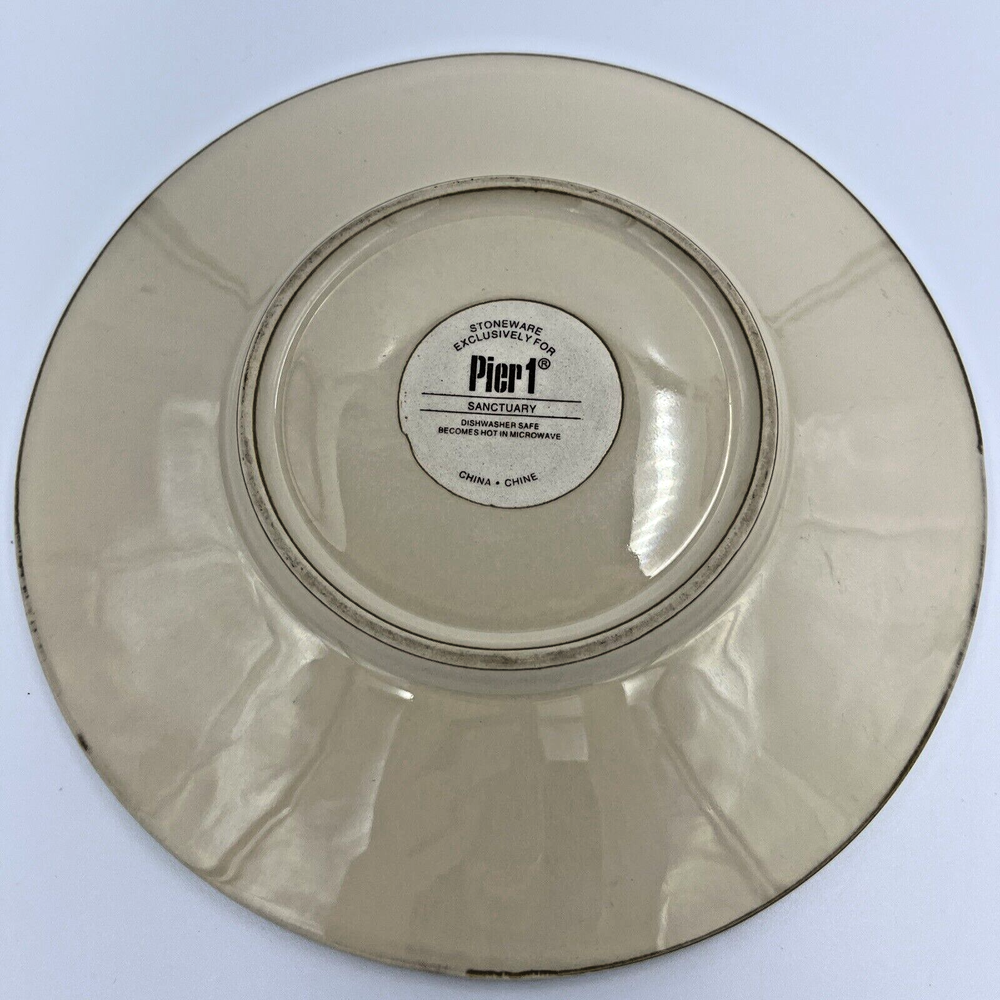 Add a touch of contemporary elegance to your dining table with this set of two Pier 1 Imports Sanctuary Salad Plates. These round plates have a diameter of 8.5 inches and are 1.5 inches high. The glossy beige finish and starburst theme make them perfect for all occasions. Crafted from ceramic, these plates are microwave and dishwasher safe and feature a printed backstamp. The set includes two plates and is an original contemporary creation from the 21st century. They weigh 2 lbs total and are ideal for any stylish and modern home. Excellent used condition-no chips or cracks. Minor utensil mark and scuffs present consistent with age and used condition.