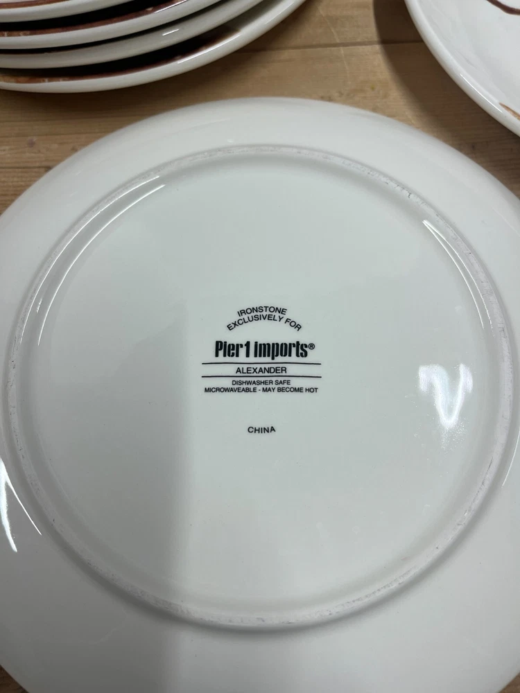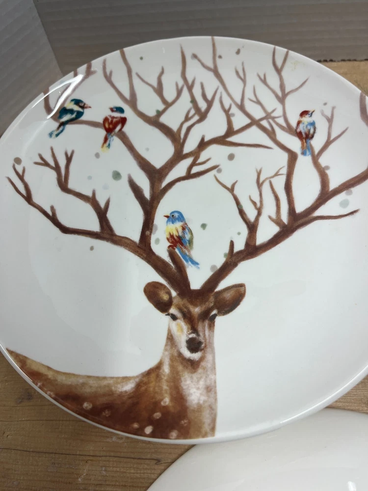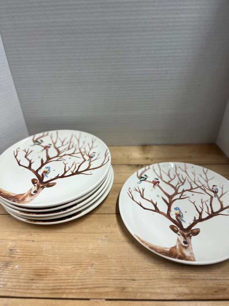 The product is a set of six Pier 1 Imports salad plates from the Alexander collection. The plates feature a deer theme and are made of ironstone in a white color. They are decorative and part of a limited edition product line. The plates have a diameter of 9 inches and are suitable for cabin, cottage, or lodge decor styles.