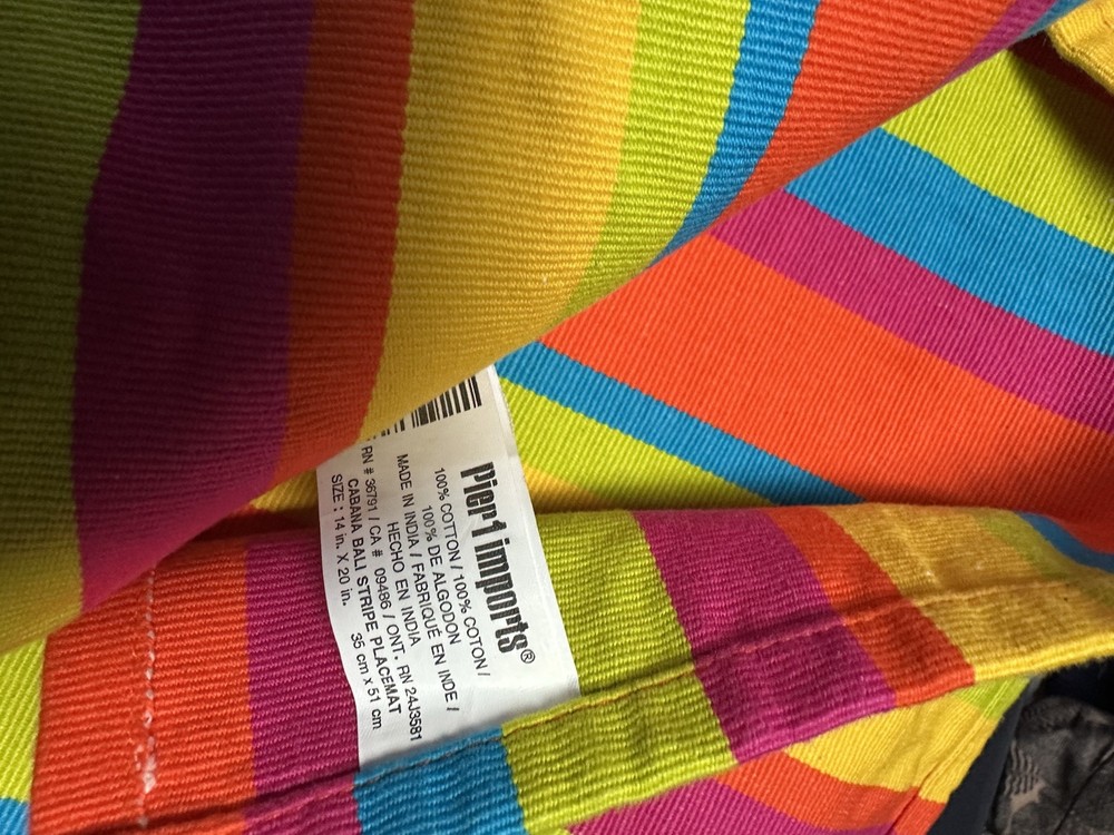 These Pier 1 placemats come in a set of 6, featuring bright striped patterns perfect for a summer outdoor theme. Made of 100% cotton, they are rectangular in shape with dimensions of 18 inches in length and 14 inches in width. The multicolor design gives off a beach/pool/summer/yard vibe, making them suitable for various occasions.