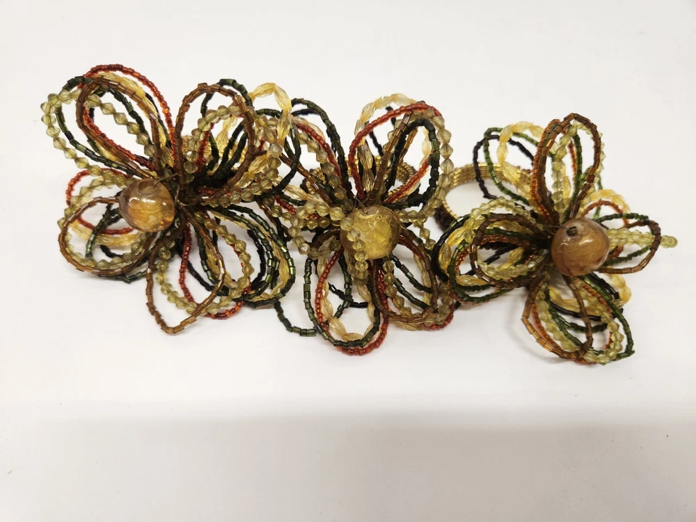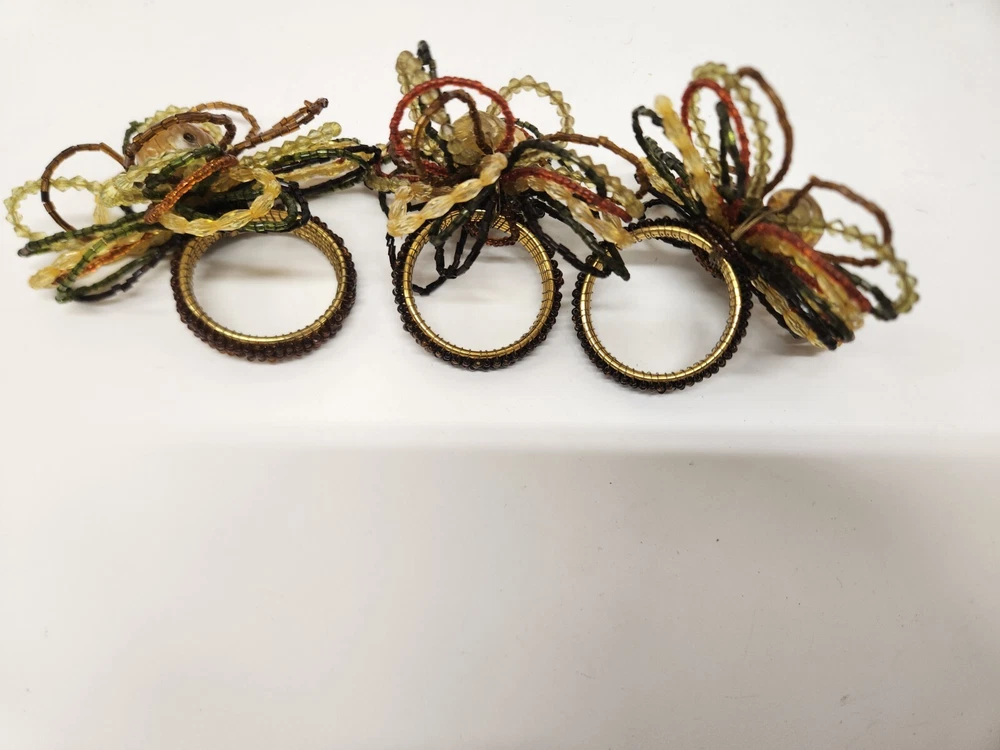 Add a touch of elegance to your dining table with this set of 3 Pier One beaded napkin rings. Featuring a beautiful floral pattern in gold, rust, and green, these rings are perfect for any occasion and will complement any table setting. Made from high-quality beads and metal, these rings are built to last and will bring a touch of sophistication to your dining experience. Whether you're hosting a formal dinner party or just having a casual meal with family and friends, these napkin rings are sure to impress. So why wait? Add this set of 3 Pier One beaded napkin rings to your collection today and elevate your dining experience to the next level!