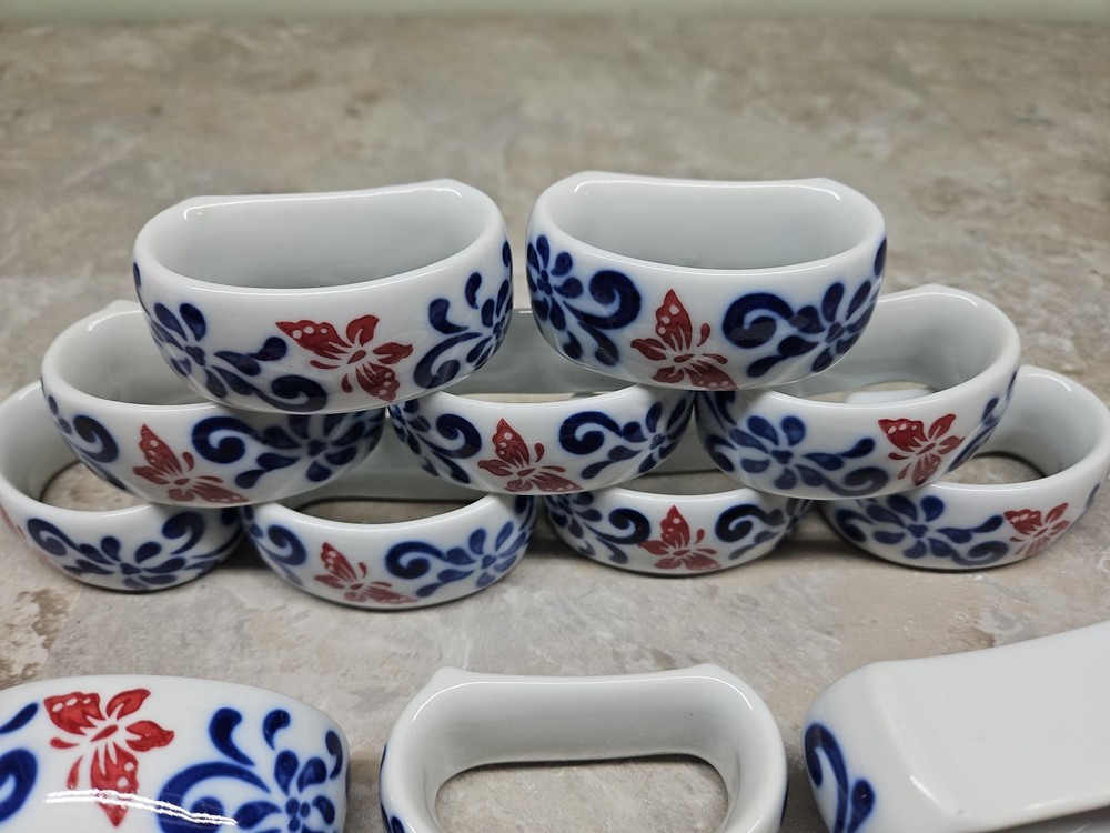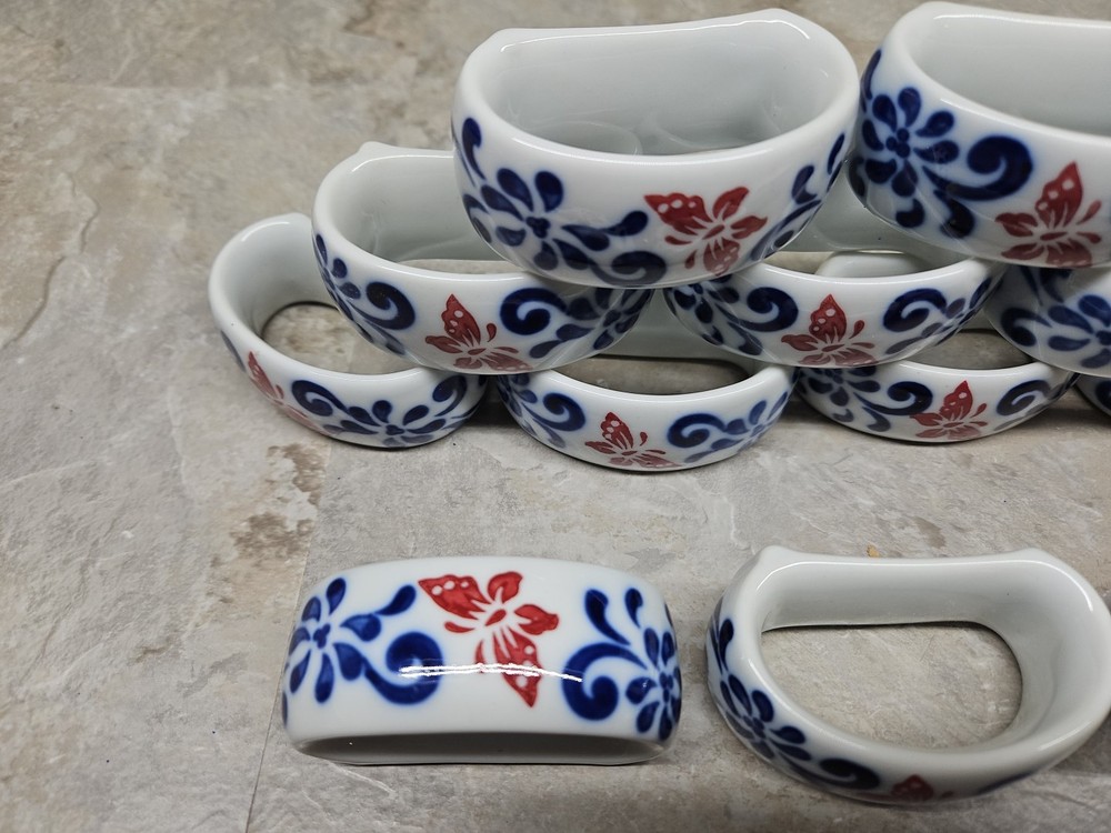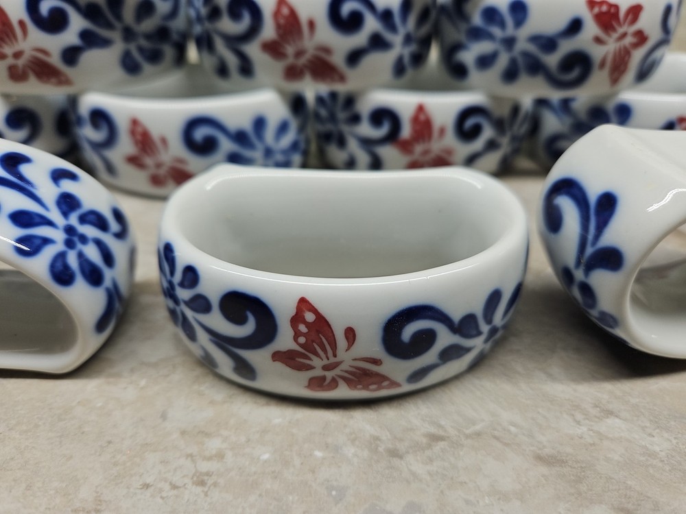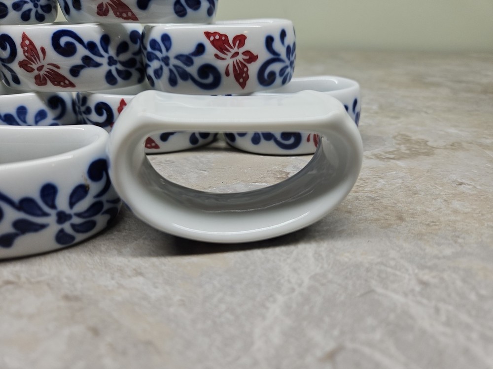 Condition is excellent and could even be passed off as new without the original box. Inspected for chips, abnormalities, production defects, and discoloration. I do eBay for fun and treat others as I would like to be treated. I've stepped up my sales since I was permanently disabled. Please ask questions. Also please reach out if dissatisfied as I am all one person shop and respond to all emails personally. The Pier 1 Brown Butterfly Floral White Cobalt Blue Ceramic Napkin Rings Set of 4 features a charming butterfly pattern in a multi-color scheme. The napkin rings are designed with a whimsical butterfly theme, adding a touch of nature to your dining table decor. Made of ceramic and originating from China, these napkin rings are a stylish and functional addition to your kitchen and dining accessories.