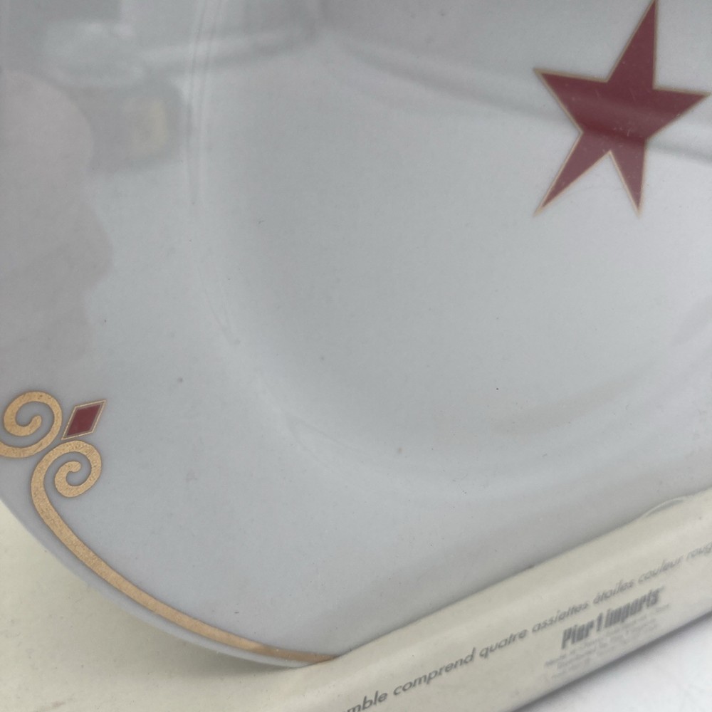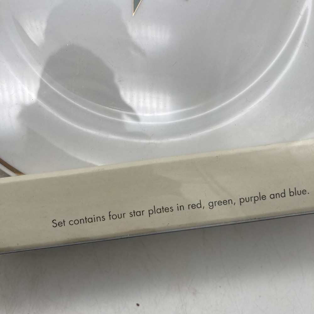 Add a touch of celebration to your dining experience with the Pier One Celebration Star Plates. This set includes four multicolored porcelain plates, each measuring 7.5 inches in diameter with a .75-inch height. The plates feature a star shape with each plat having a different color star - red, green, purple, blue and a glossy finish, making them perfect for appetizers, desserts, and salads. The Celebration "Star" pattern is perfect for all occasions, including birthdays, graduations, and even Christmas. These limited edition plates are stackable and decorative, making them a great addition to your home decor. They come with care instructions for hand washing only and are original pieces from Pier 1. The plates were manufactured in China in the 2000s and are part of the 21st-century era. Get ready to celebrate with style using these beautiful and unique plates. Track Page Views With Auctiva's Counter