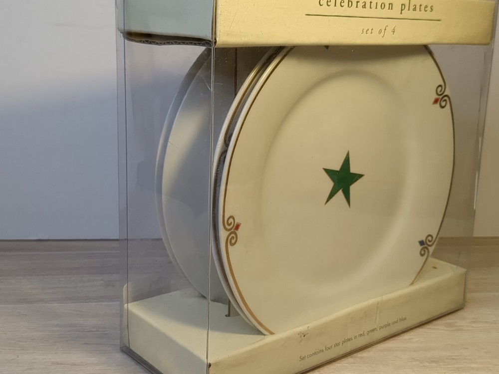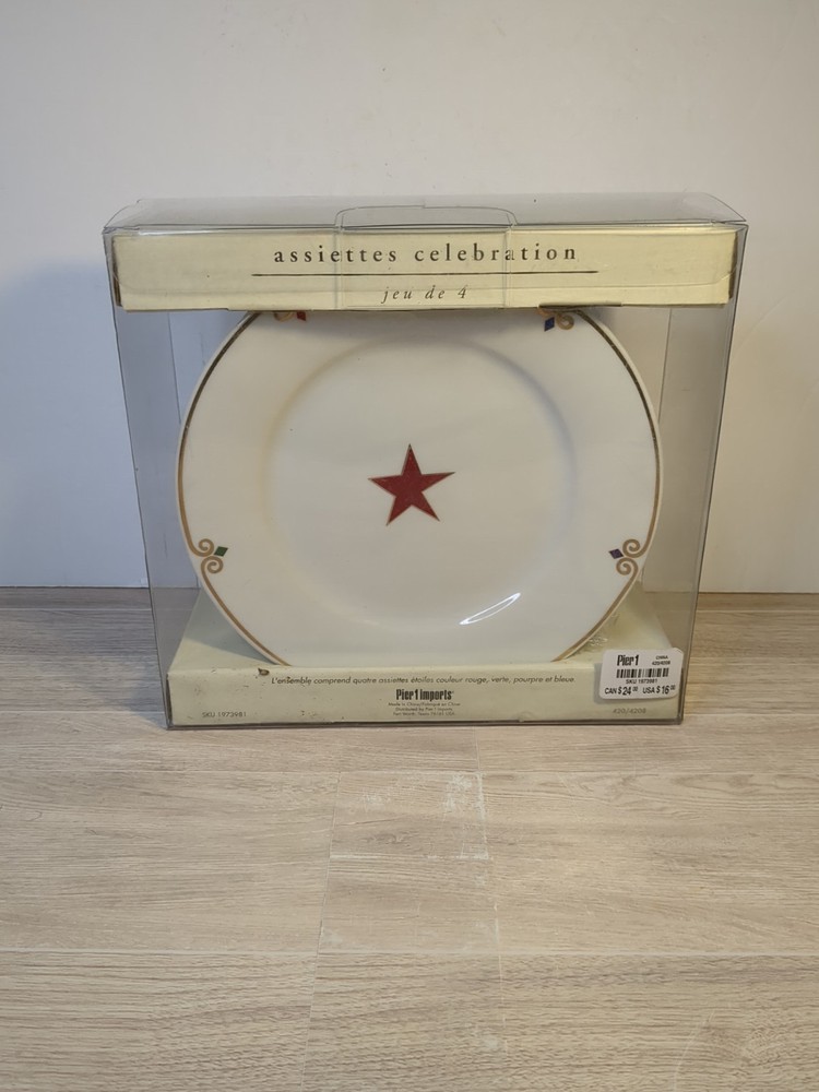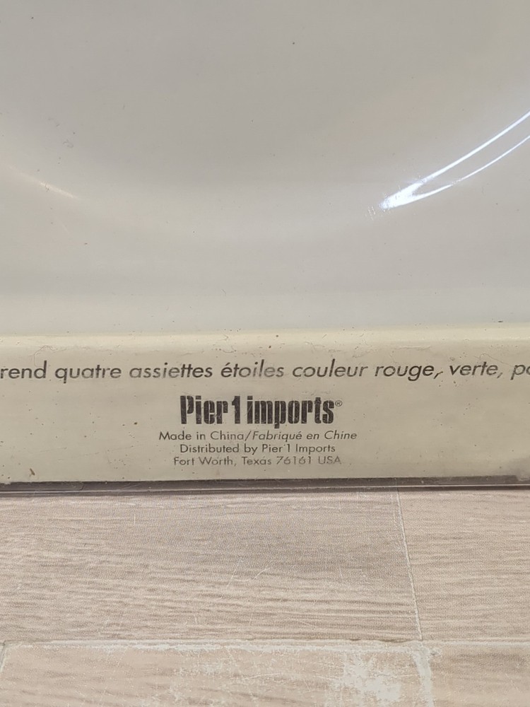Elevate your dining experience with the Pier One Celebration Star Plates, a set of four that's perfect for any occasion. Crafted from high-quality porcelain, these plates boast a vibrant multicolor "Star" pattern that adds a touch of elegance to your table setting. Whether you're hosting a casual get-together or celebrating a special event, these plates are sure to impress your guests. Each plate measures 7.5 inches in diameter with a height of .75 inch, making them ideal for appetizers, salads, and desserts. They feature a glossy finish and a stackable design for easy storage. These pieces, manufactured between 2000-2009, are a part of Pier 1's collection and come with a printed backstamp confirming their authenticity. Carefully hand wash only to maintain their beauty.