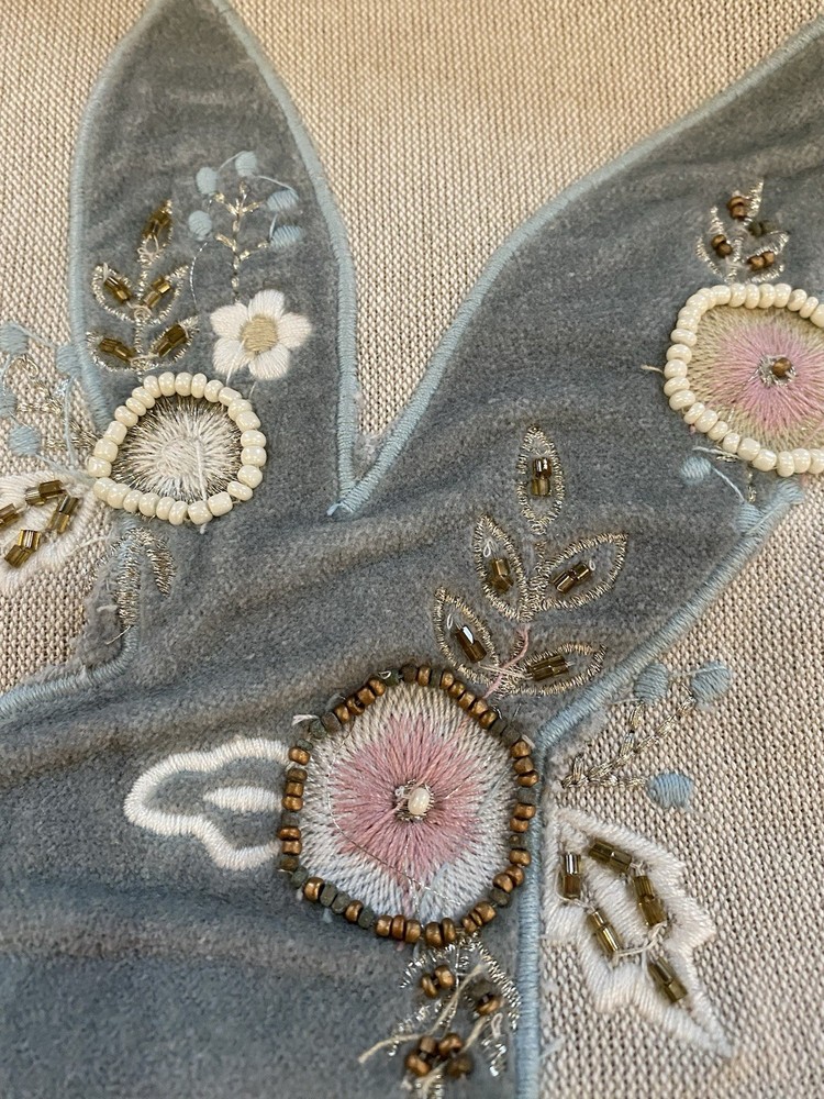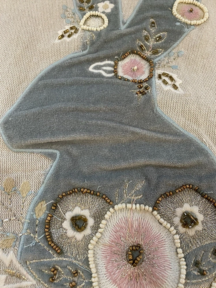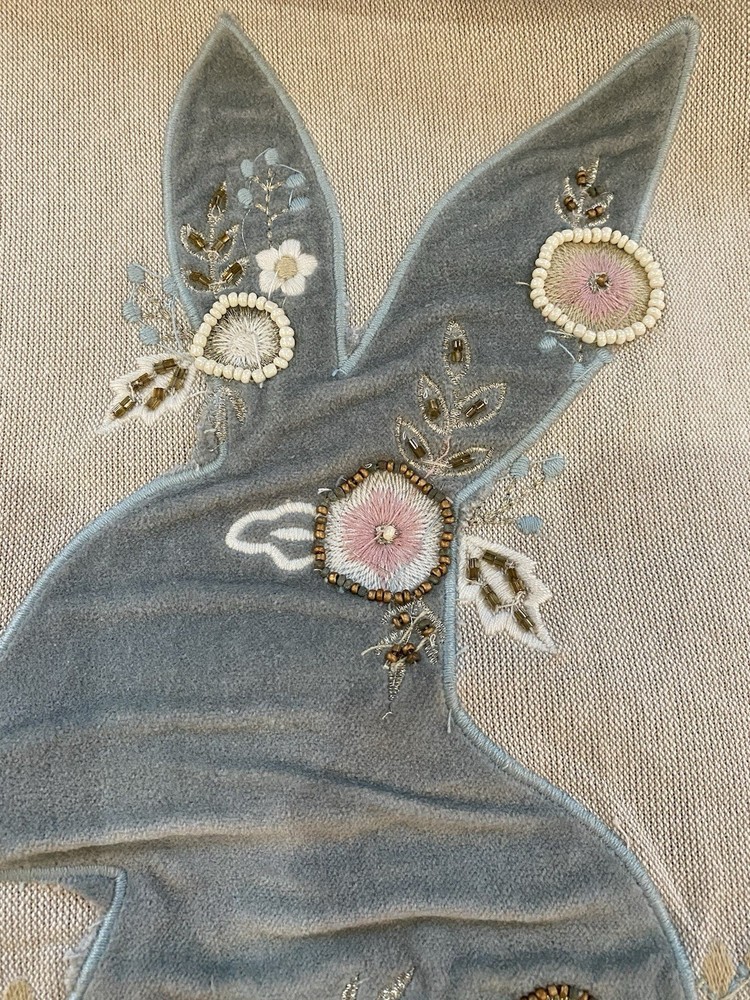 Pier One Table Runner Linen Beaded Embroidery Bunny Rabbit Velvet Spring Easter In very good condition. Retired.