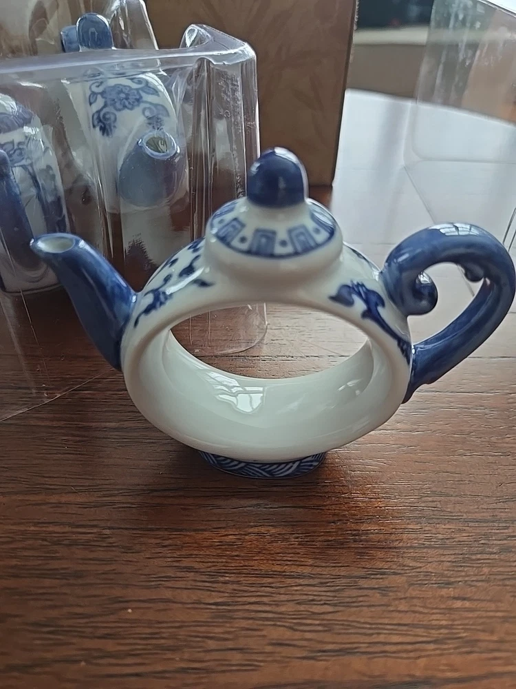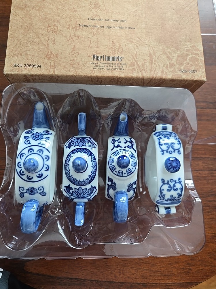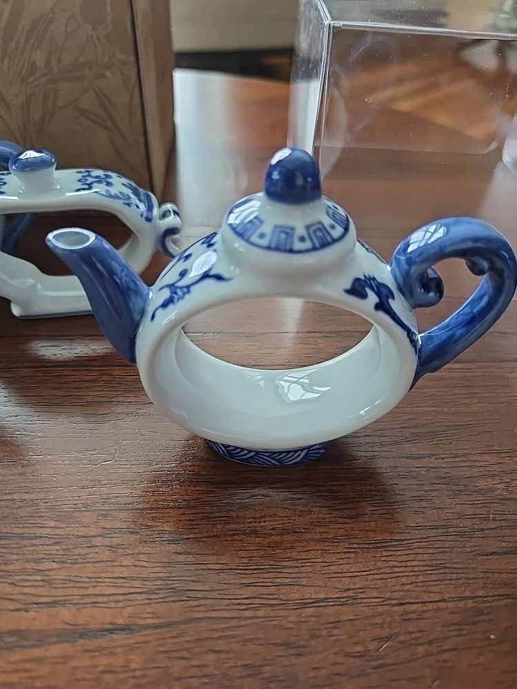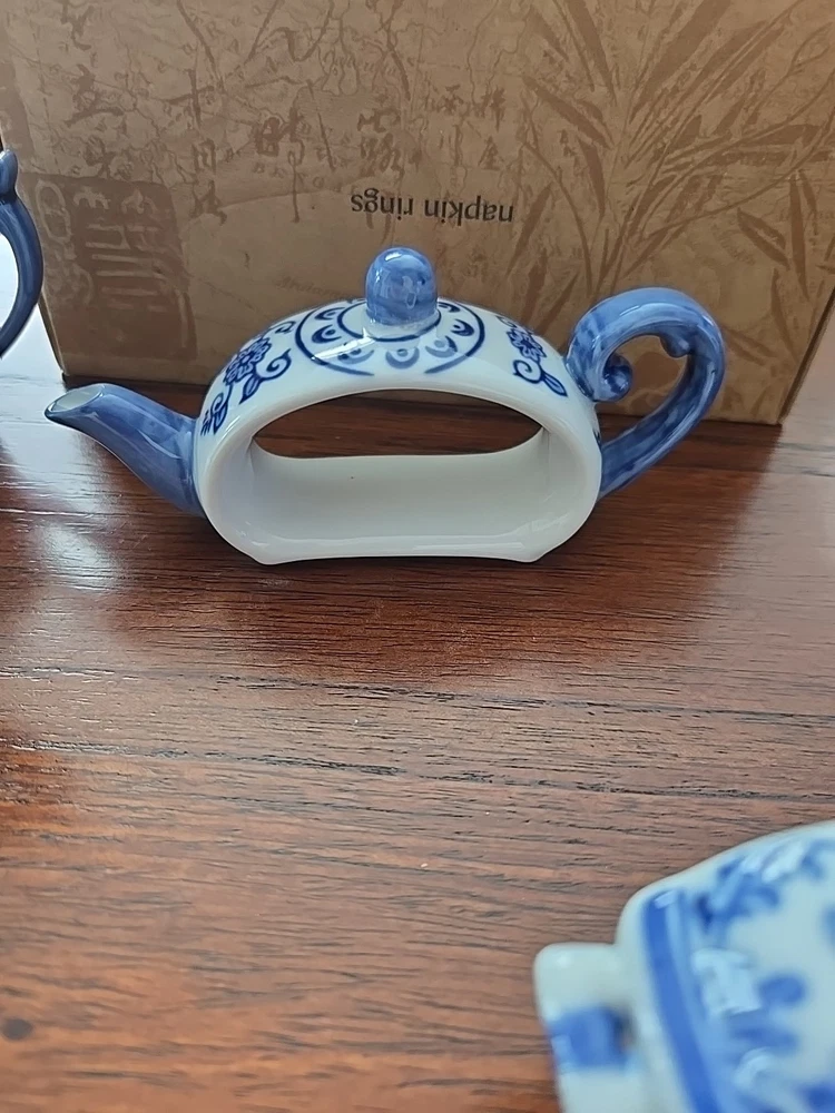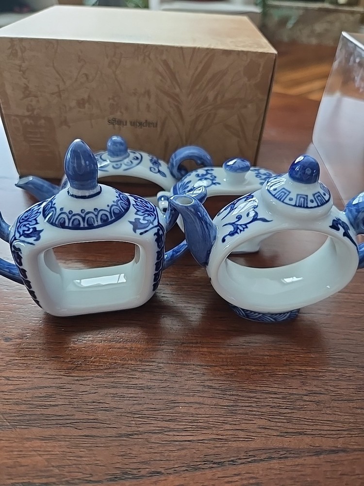 Pier One English Tea Time Porcelain White & Blue Teapot Napkin Rings Set 4 NEW Original Box 4 sets available...