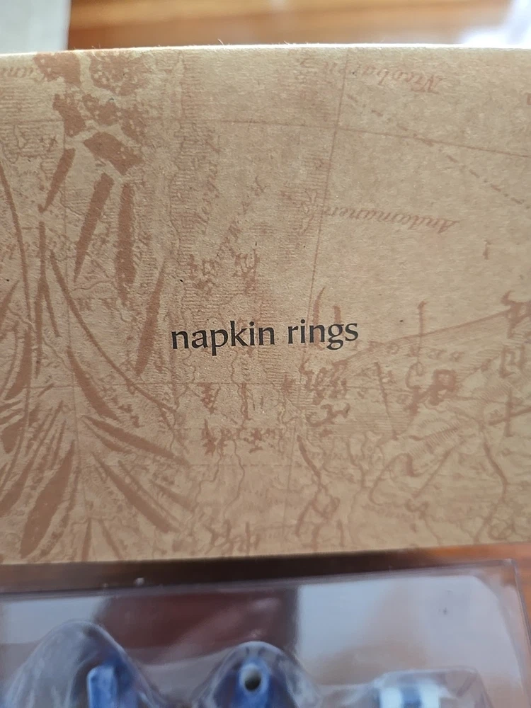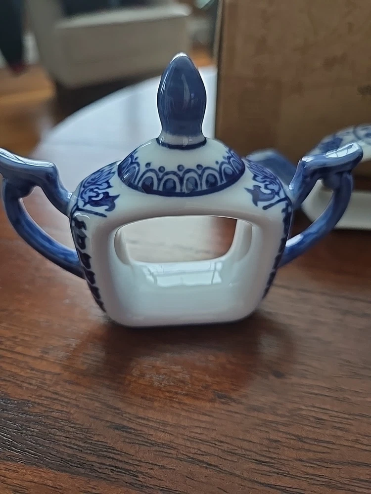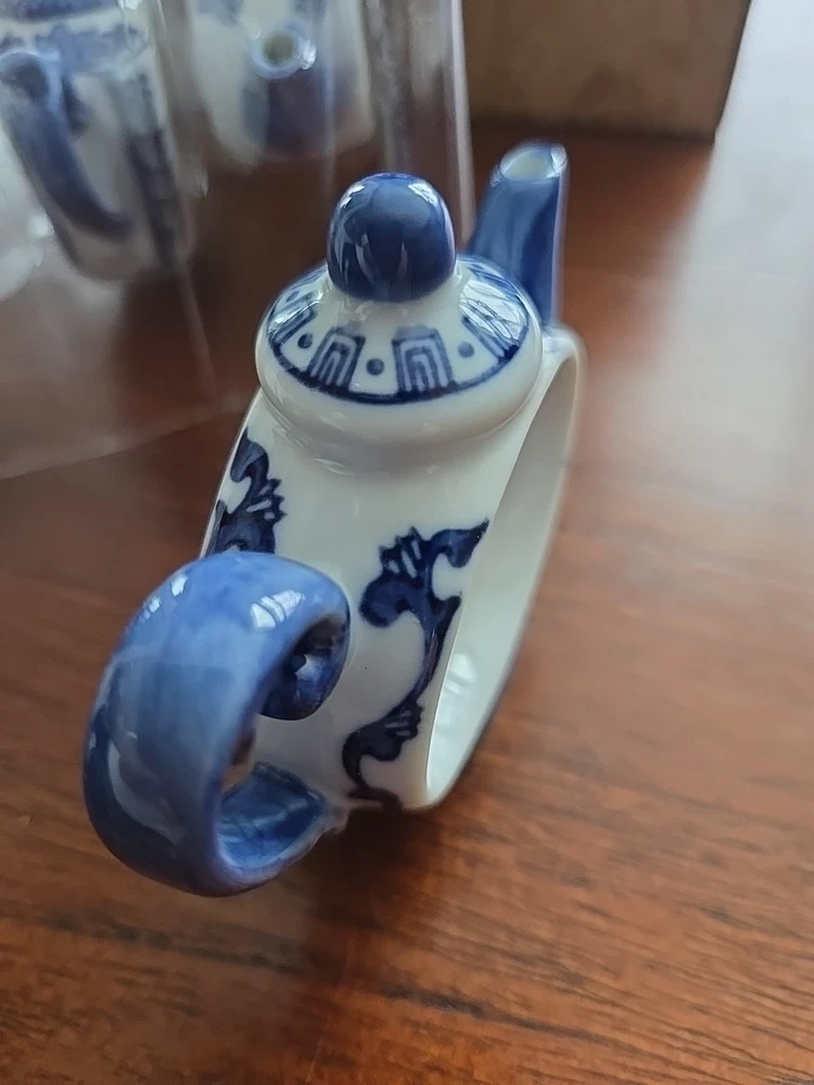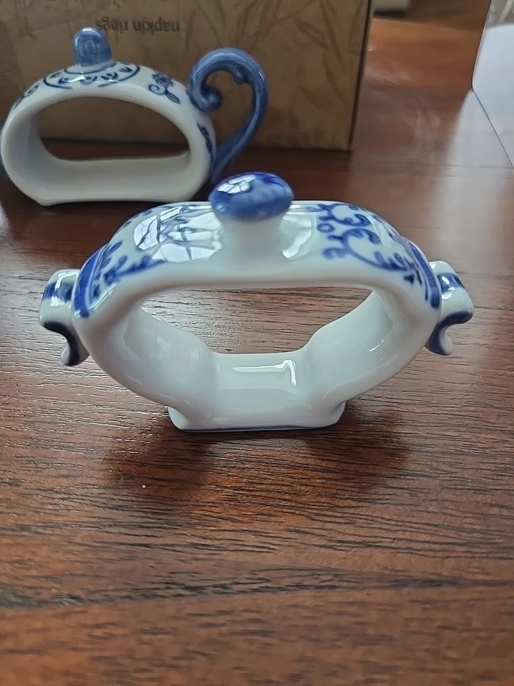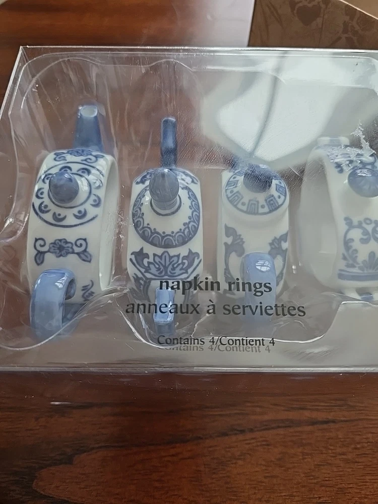 Pier One English Tea Time Porcelain White & Blue Teapot Napkin Rings Set 4 NEW Original Box 4 sets available...