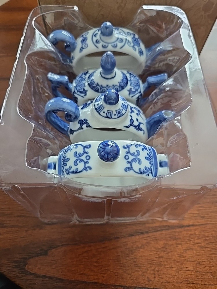 Pier One English Tea Time Porcelain White & Blue Teapot Napkin Rings Set 4 NEW Original Box 4 sets available