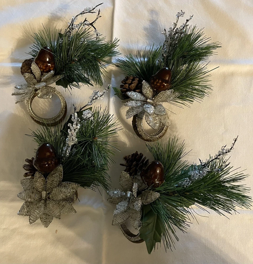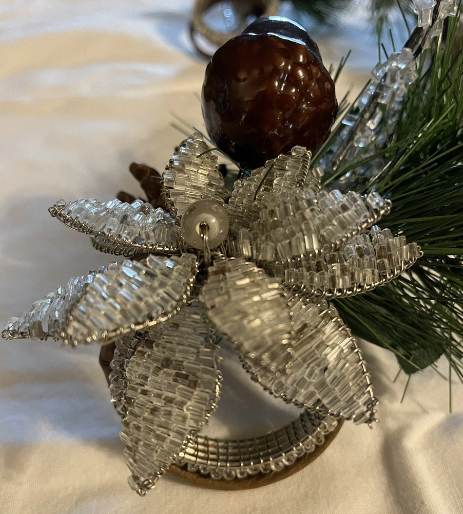Add a touch of elegance to your table setting with this set of 4 napkin rings. The beaded ring is expertly crafted into a beautiful botanical design, featuring faux branches, pinecones, acorns, and a beaded poinsettia. Each napkin ring is adorned with a unique combination of winter decor , making it perfect for any winter holiday design. Spritz with warm water and let dry for easy care. These napkin rings are a must-have for any Christmas or party occasion, and will add a festive touch to any table. Made in India.