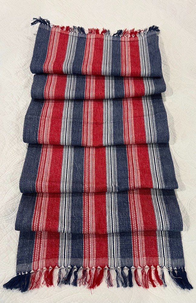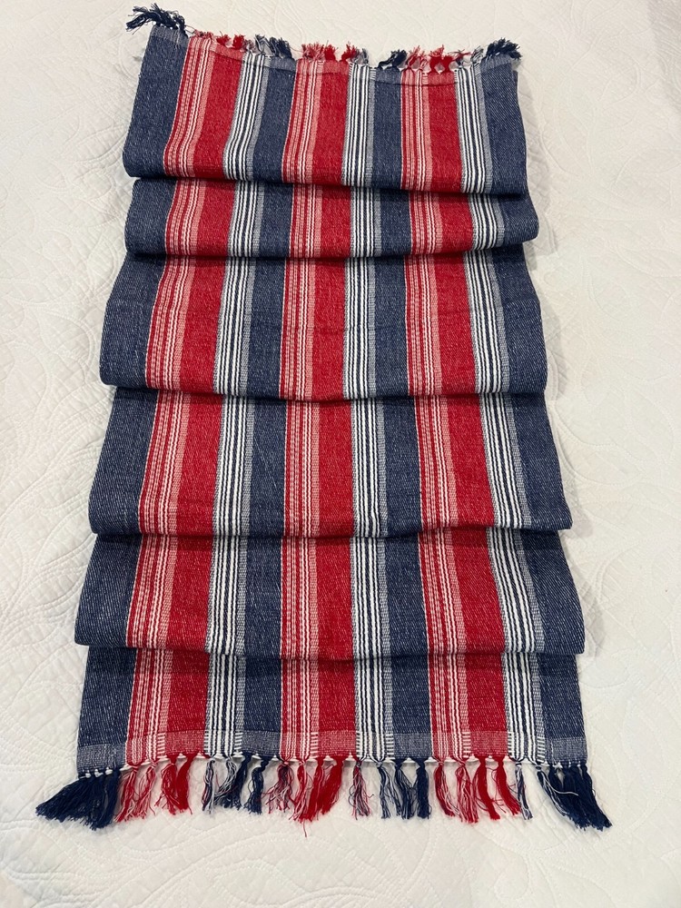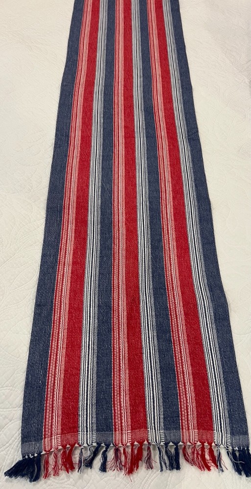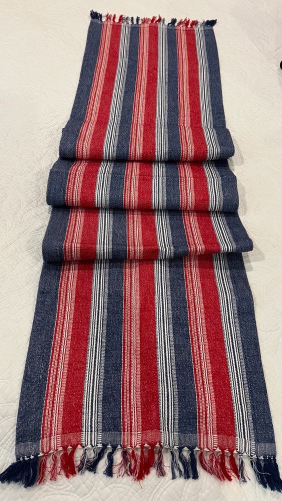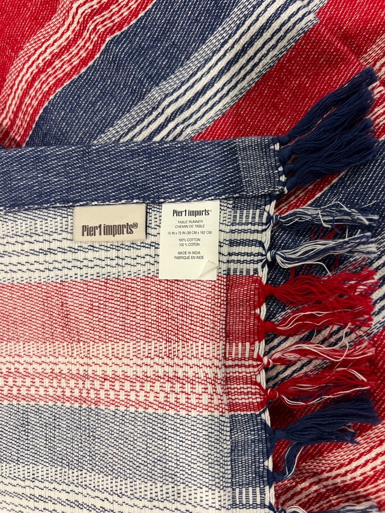 The Pier One Imports Chemin De Table is a stylish and versatile table runner perfect for adding a touch of Americana flair to your dining table. Made from durable cotton material, this oblong table runner features a classic striped pattern in red, white, and blue, making it ideal for both casual and formal dining occasions. With dimensions of 72" in length and 15" in width, this table runner from Pier 1 is a practical and stylish addition to any home decor.