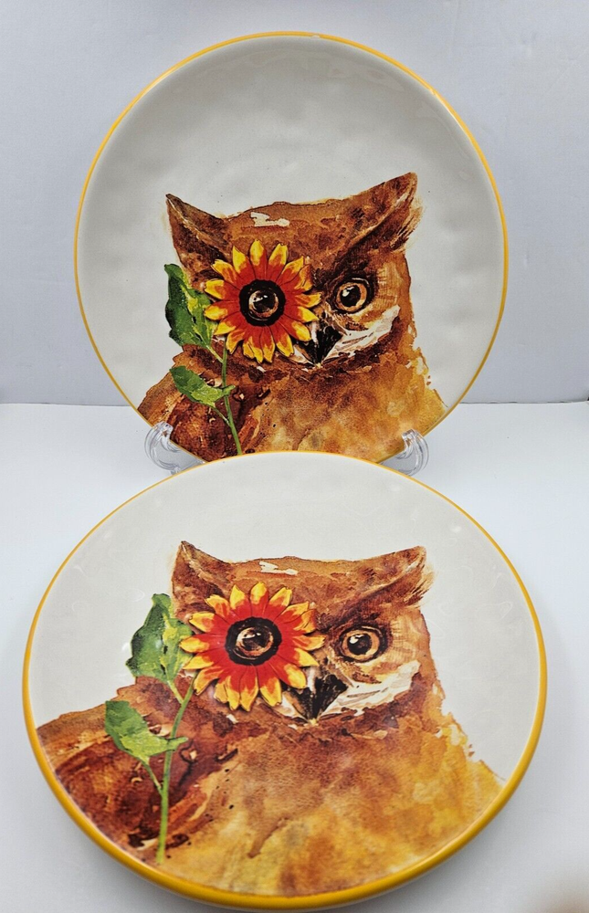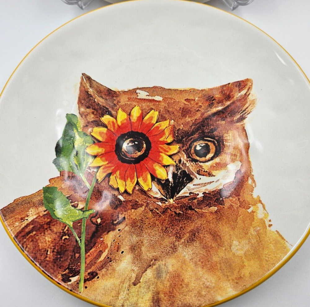 Pier One Imports Harvest Garden Critters Salad Plates Set of 2 OWL 8.25" Plates - pre owned with no chips or cracks - Hand Painted and perfect for your Fall Autumn Home Decor - two Owl & Sunflower Pla...