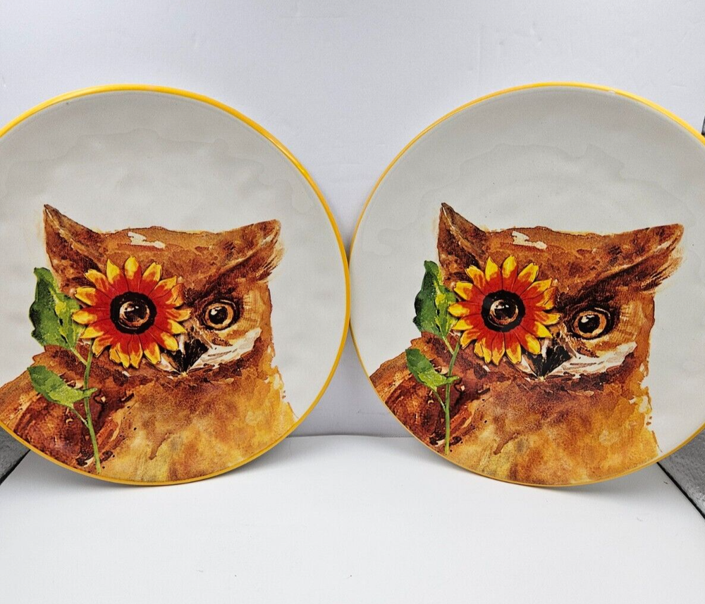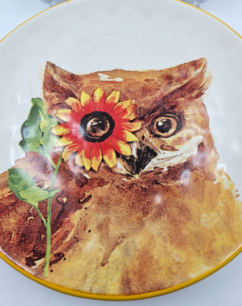 Pier One Imports Harvest Garden Critters Salad Plates Set of 2 OWL 8.25" Plates - pre owned with no chips or cracks - Hand Painted and perfect for your Fall Autumn Home Decor - two Owl & Sunflower Plates ***Please view pictures***
