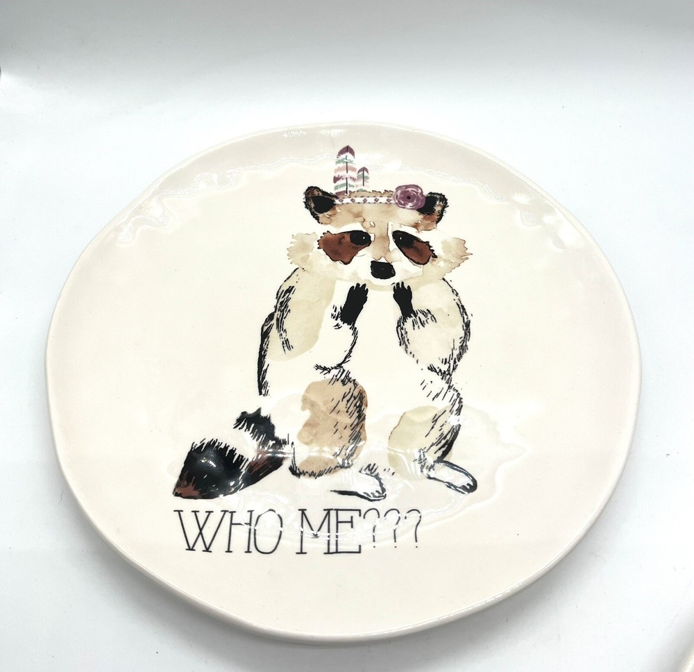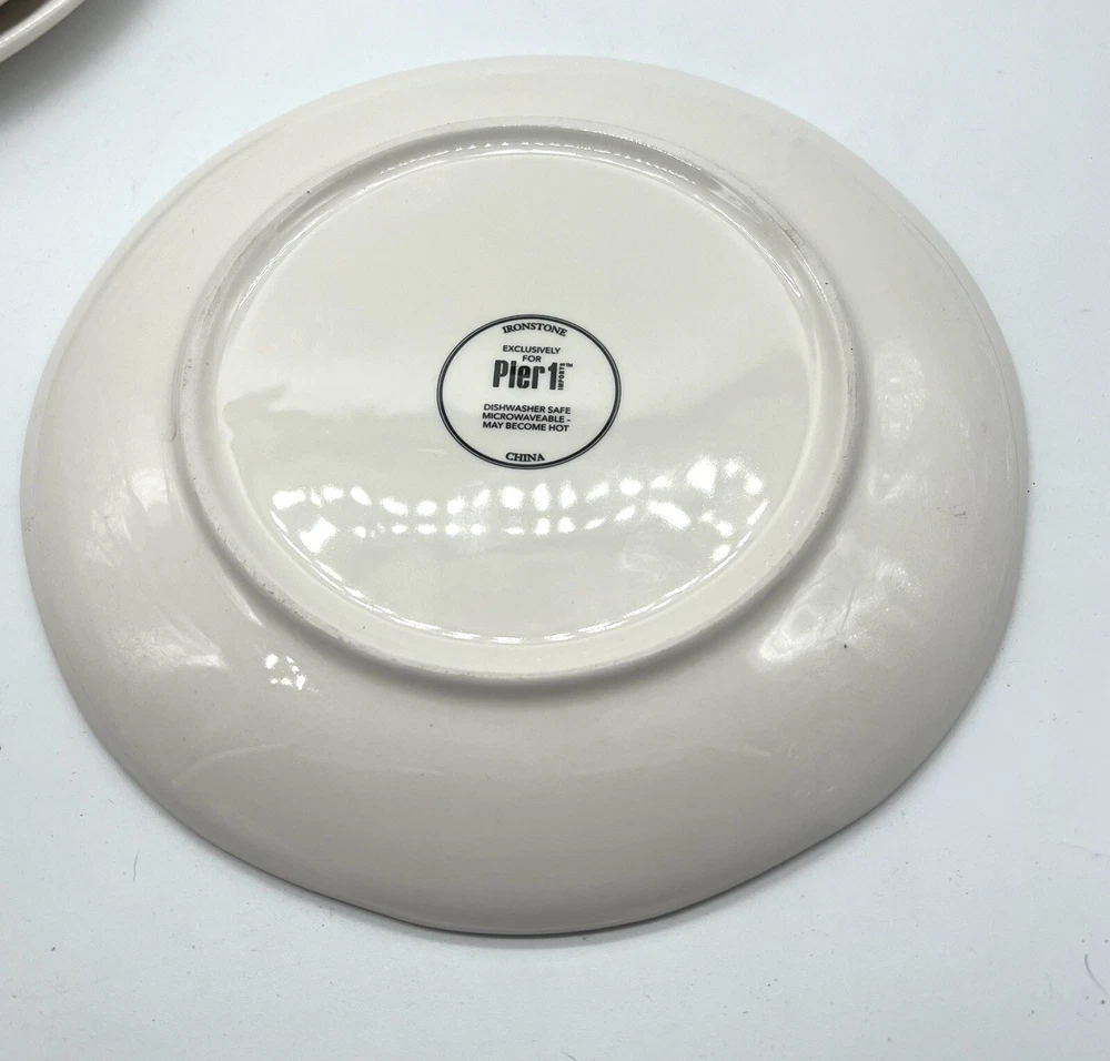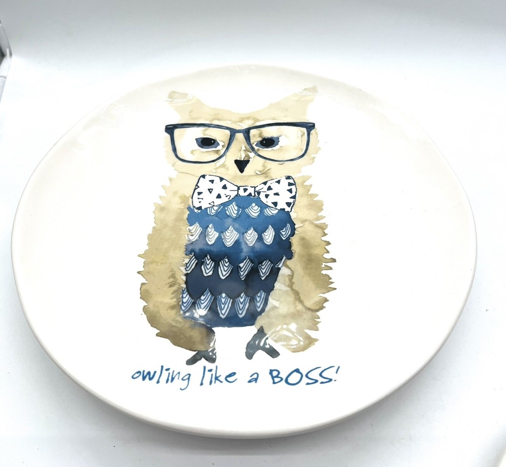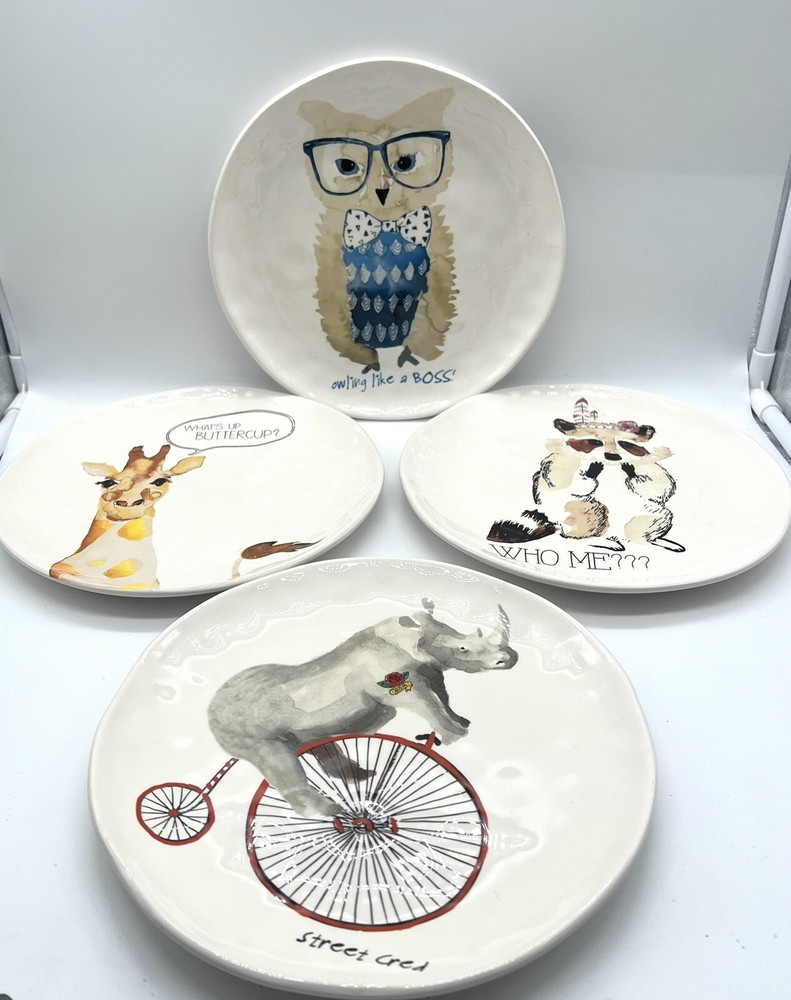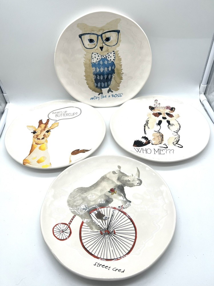 This set of four whimsical salad/dessert plates from Pier 1 Imports features charming fun animals with sayings on a multicolor ironware background. Measuring 8 7/8 inches in diameter, these plates are perfect for all occasions. The backstamp is printed and the finish is glossy. Each plate weighs approximately one pound and is made of durable ironstone. Whether you're hosting a dinner party or simply adding to your collection, these plates are sure to delight. A couple of manufacturer imperfections similar to Rae Dunn.