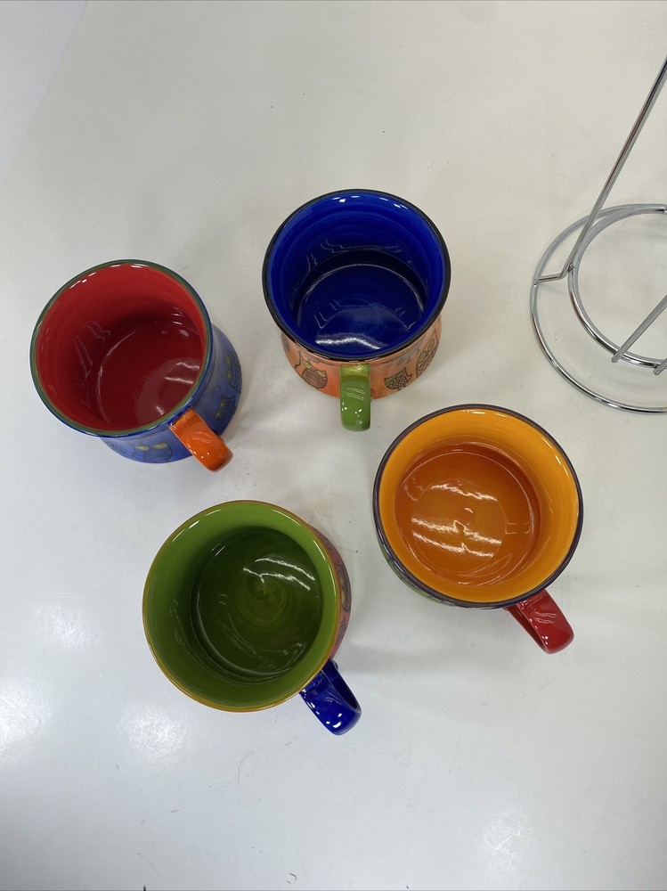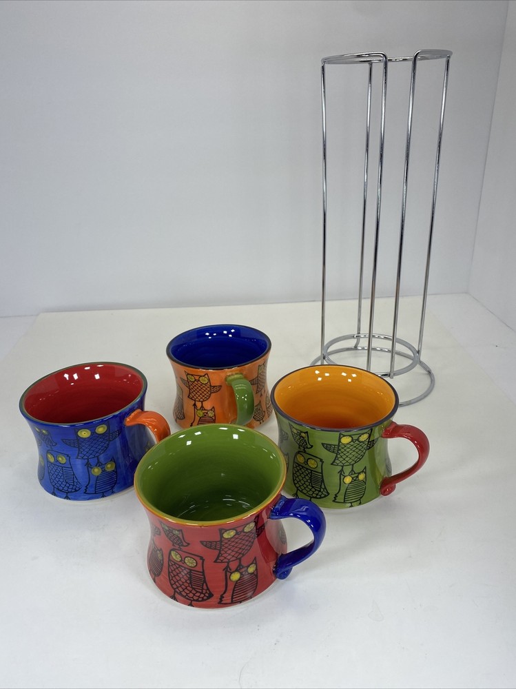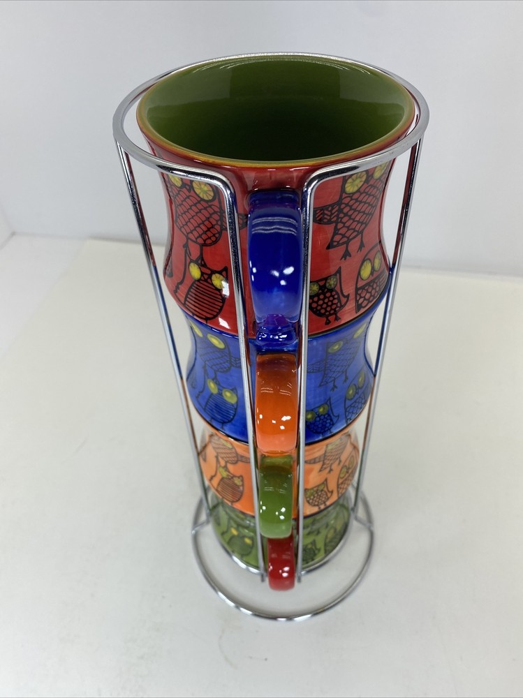 Pier One Imports Owl bird Mug Set Stackable, green blue red orange, HandPainted. . With Rack. 20220827SEC...