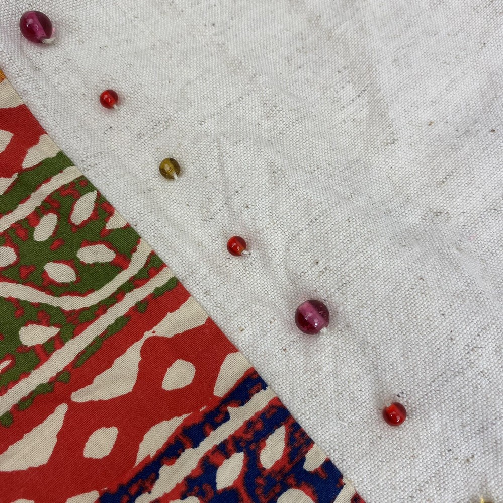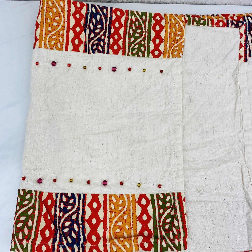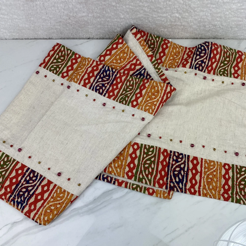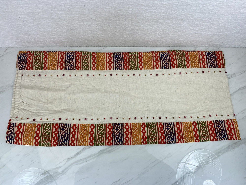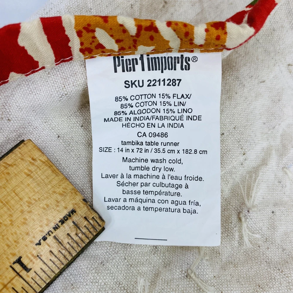 Pier One Imports Pier 1 Tambika Table Runner Beaded Stripe Edge 68 x 14" Flax This table runner is in good condition. No tears or stains. Batik styled pattern on edge with a beaded border. Fabric is 85% Cotton / 15% Flax. Believed to have been washed as it measures 68 x 14 inches rather than the 72 x 14 as stated on tag. Please see photos for details.