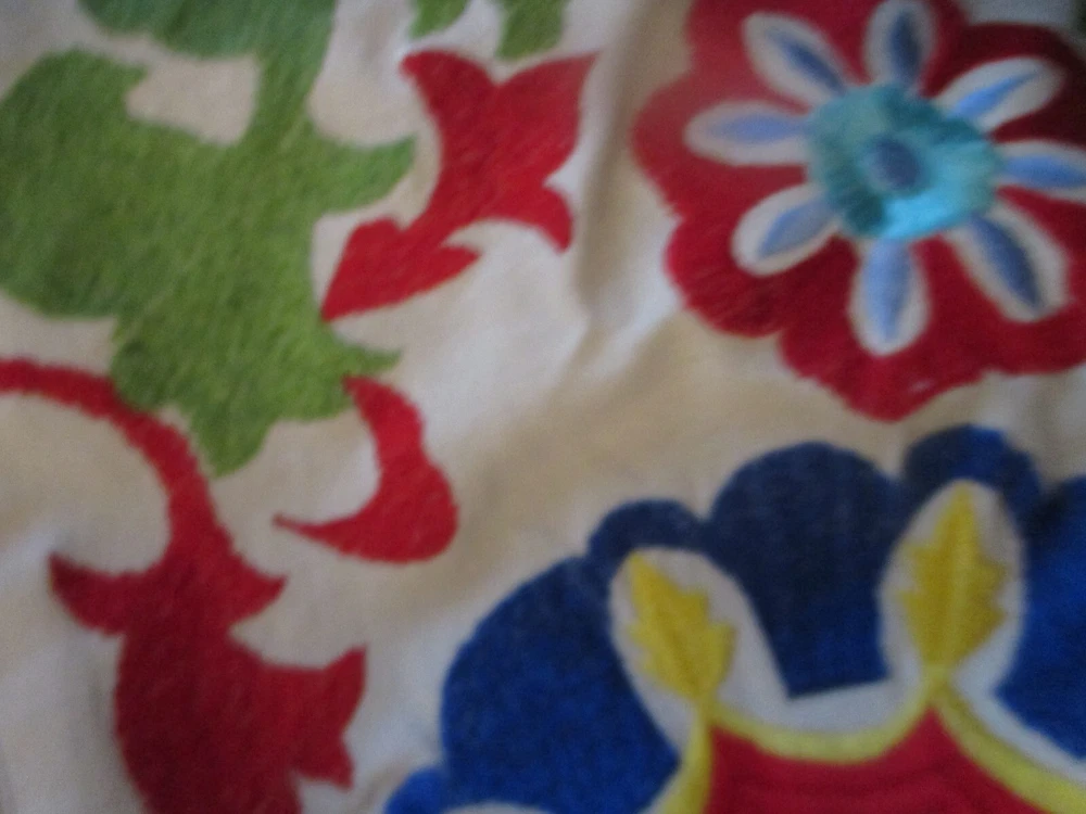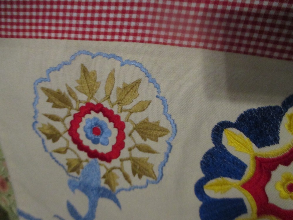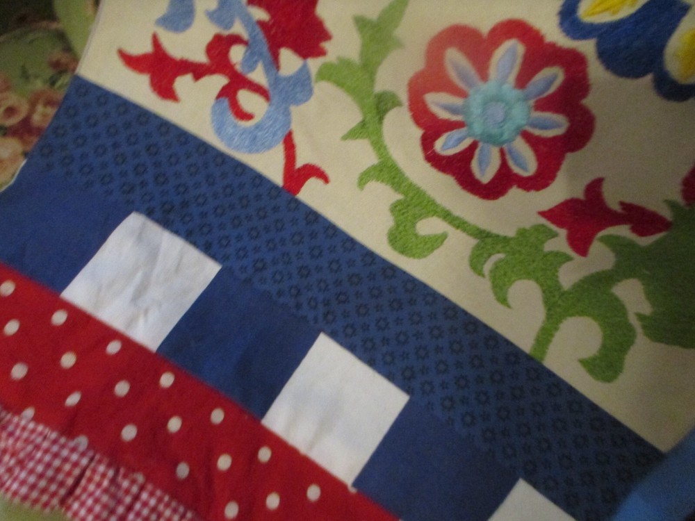 Pier 1 Imports Table Runner. Measuring 14 x 72 long. Nice and colorful - embroidered floral and stripe fabric print. Love the colors on this. Previously owned, in wonderful clean condition. Non smoking household.