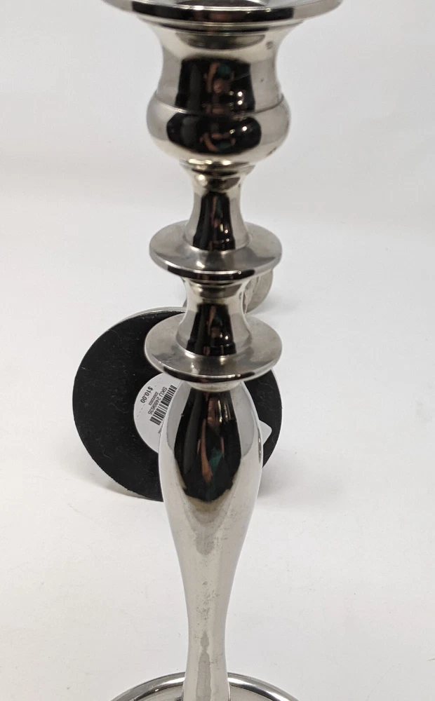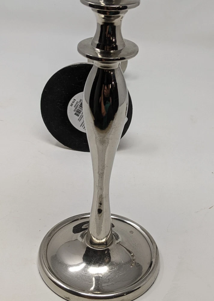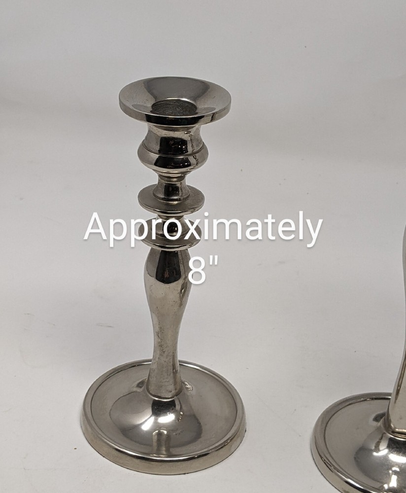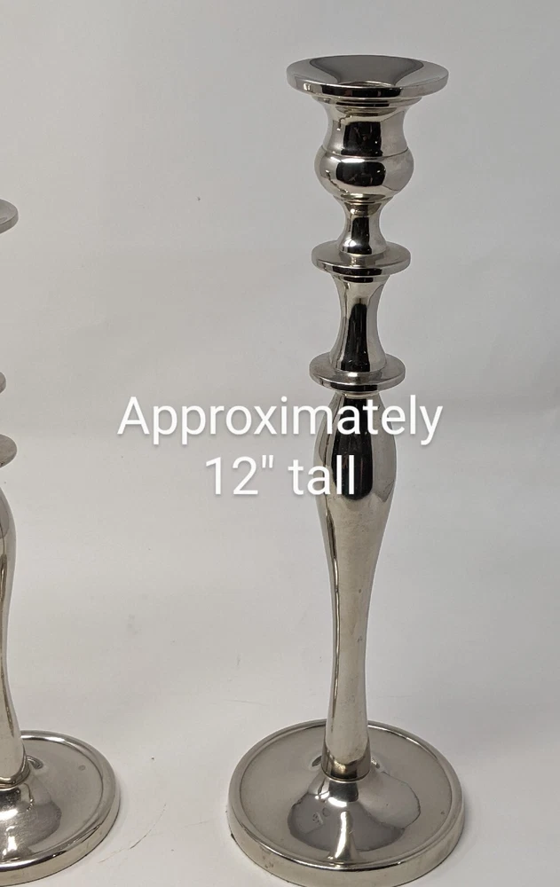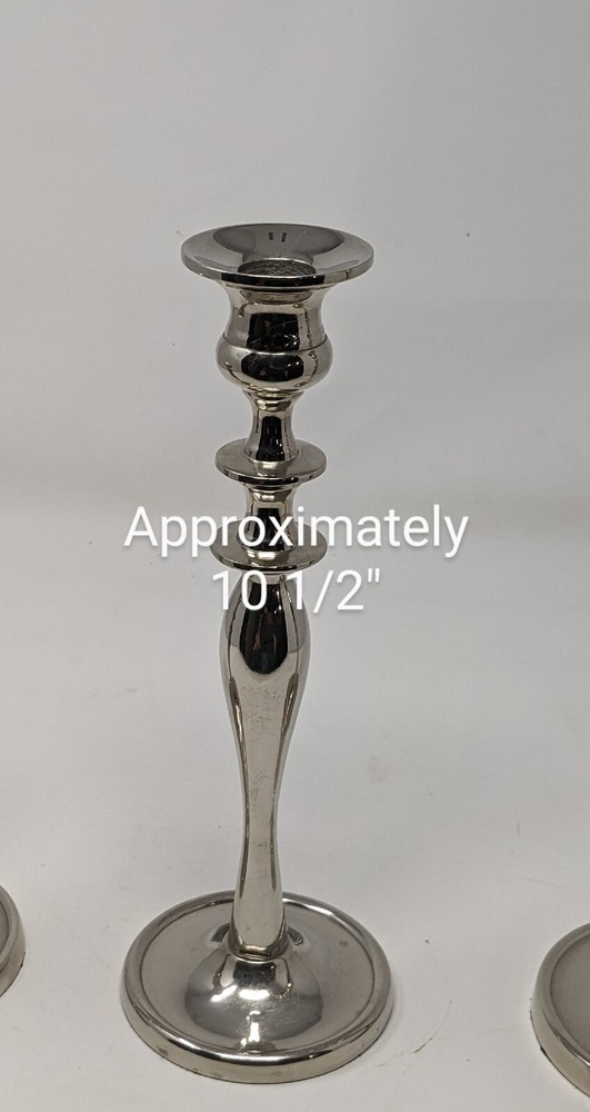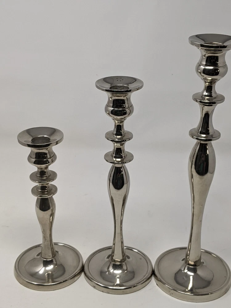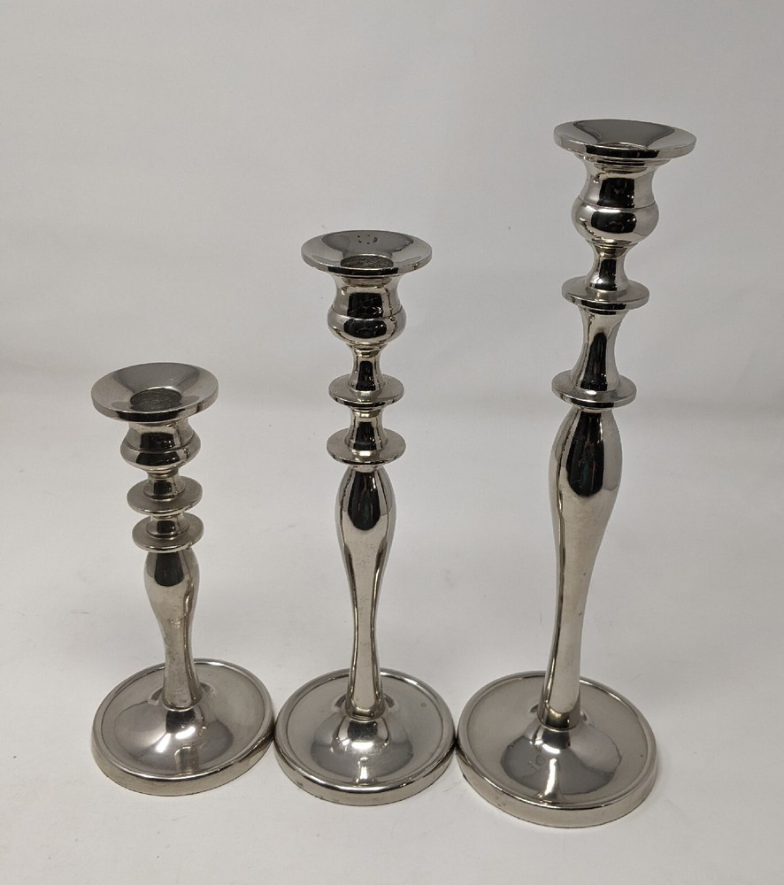 Pier One Imports Graduated Tapered Shiny Silver Candle Holders Three In Total 2011. There are three candle holders in three different sizes. Please see photos. These have been pre-owned still in good condition. Minimal signs of use with an item from 2011. These are shiny silver, I am not sure what type of metal. There are surface scratches and a couple of spots. These are still very pretty. Please see all of the photos. 12L