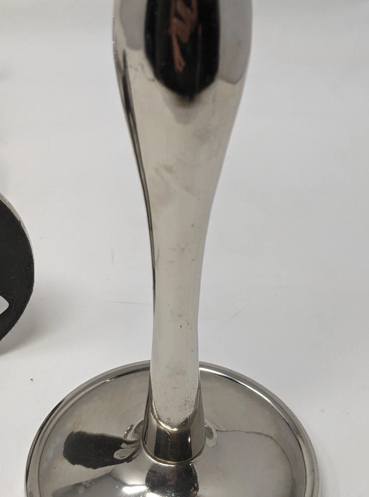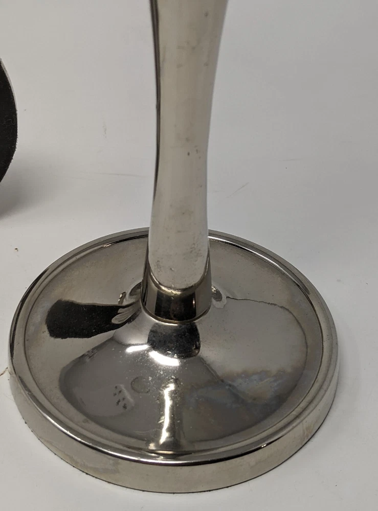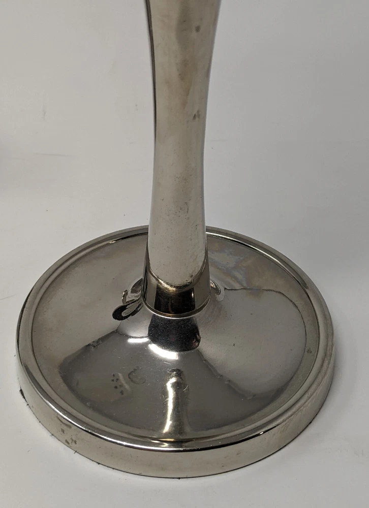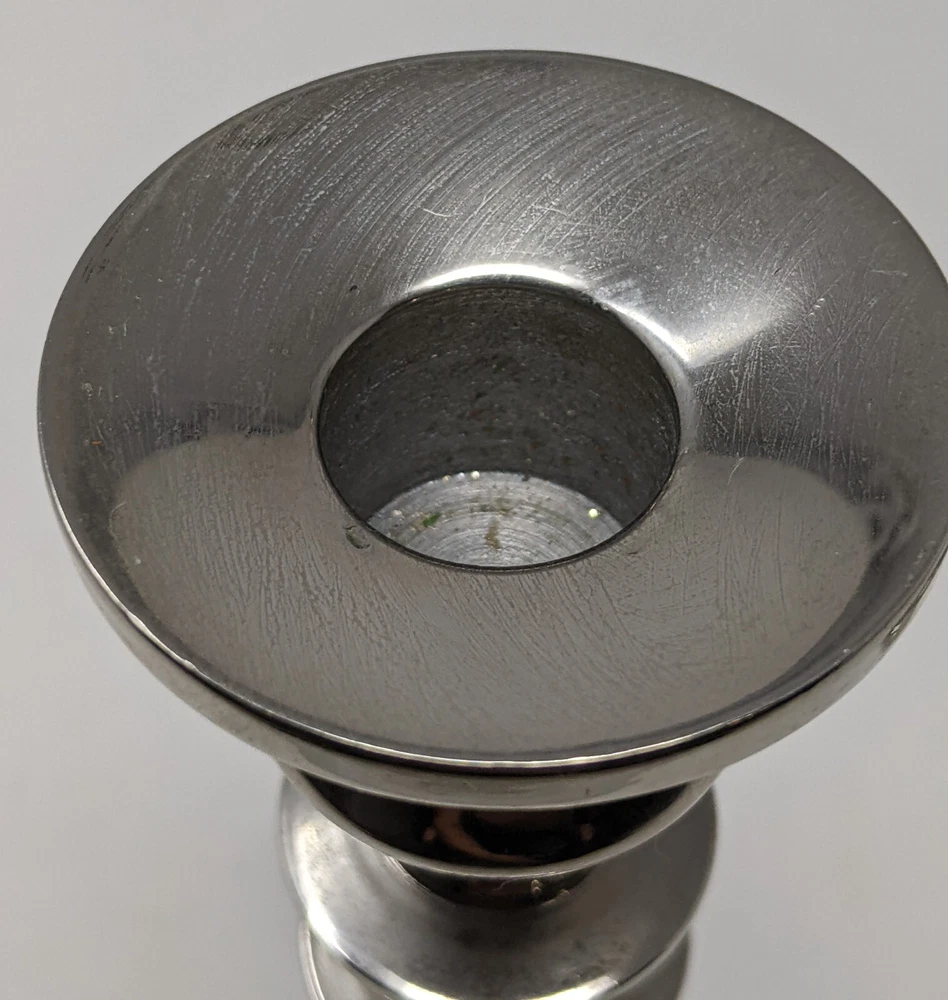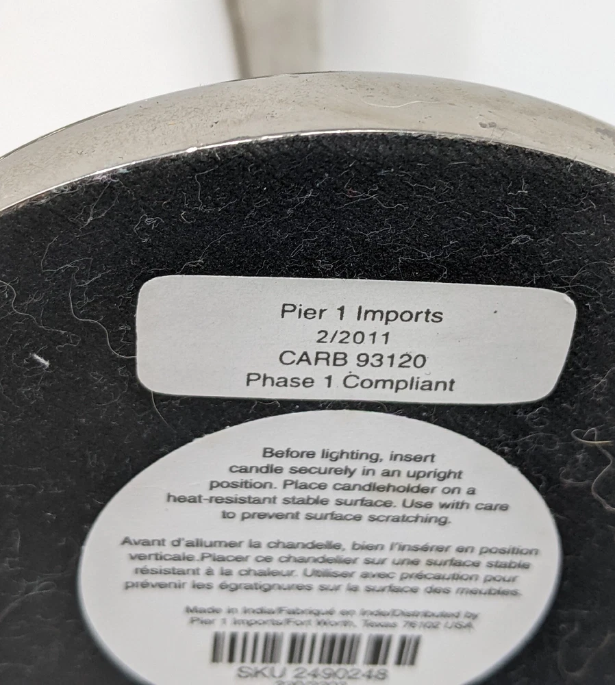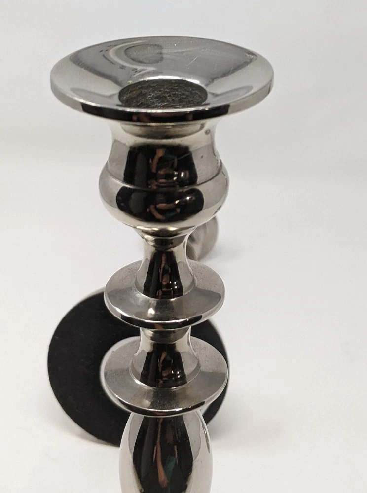 Pier One Imports Graduated Tapered Shiny Silver Candle Holders Three In Total 2011. There are three candle holders in three different sizes. Please see photos. These have been pre-owned still in good condition. Minimal signs of use with an item from 2011. These are shiny silver, I am not sure what type of metal. There are surface scratches and a couple of spots. These are still very pretty. Please see all of the photos. 12L