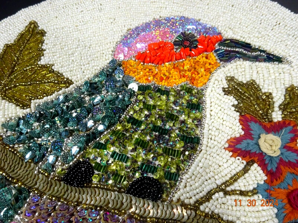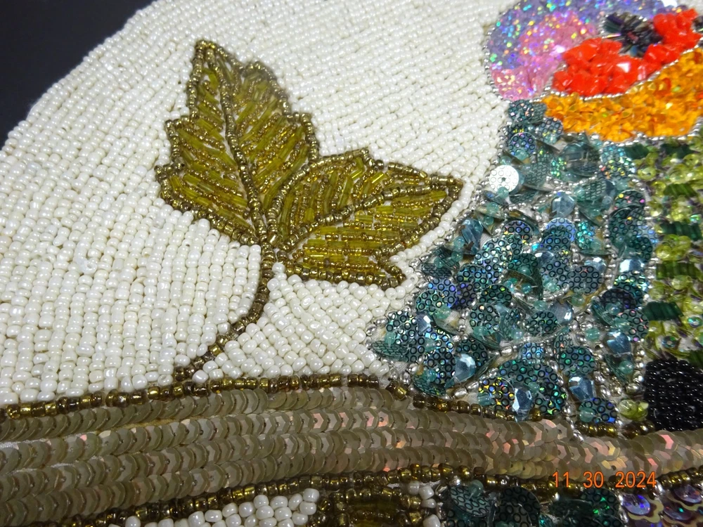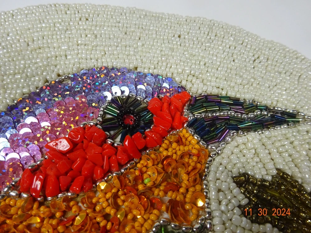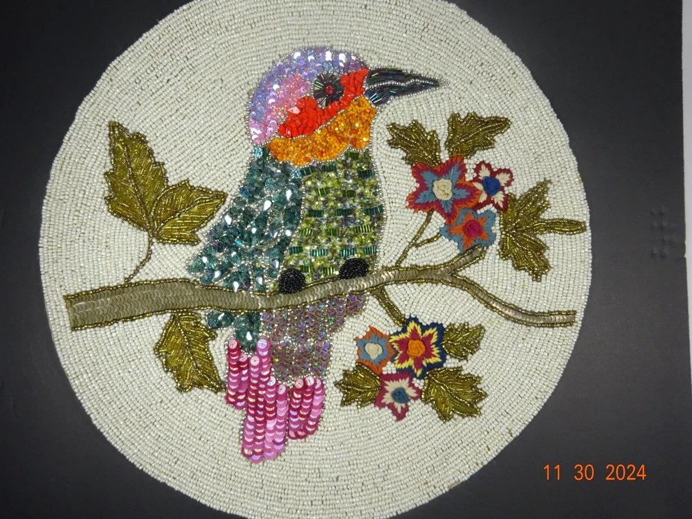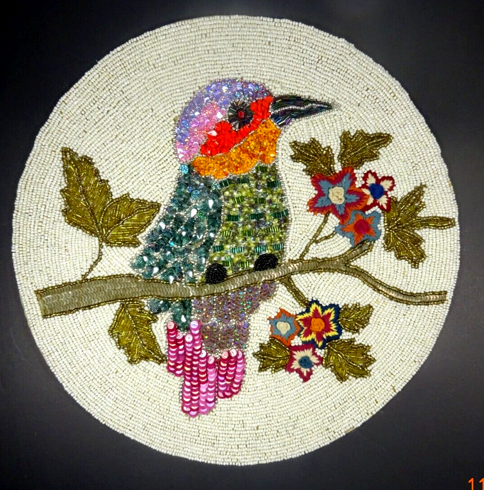 Beautiful Hand Stitched Pier One Material - beads , sequence cotton thread Measures - 15" Round Condition looks pretty good , on edge 1/4" 3 beads missing Not noticeable Shipping - I only charge the actual cost to your area. Thanks so much for looking. Have a nice day.