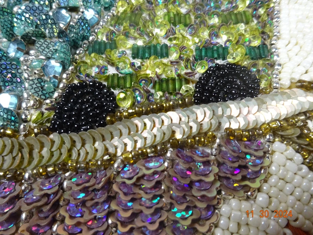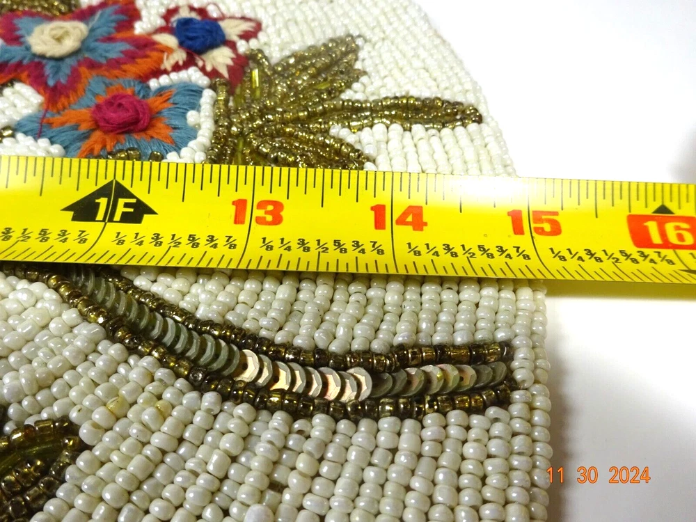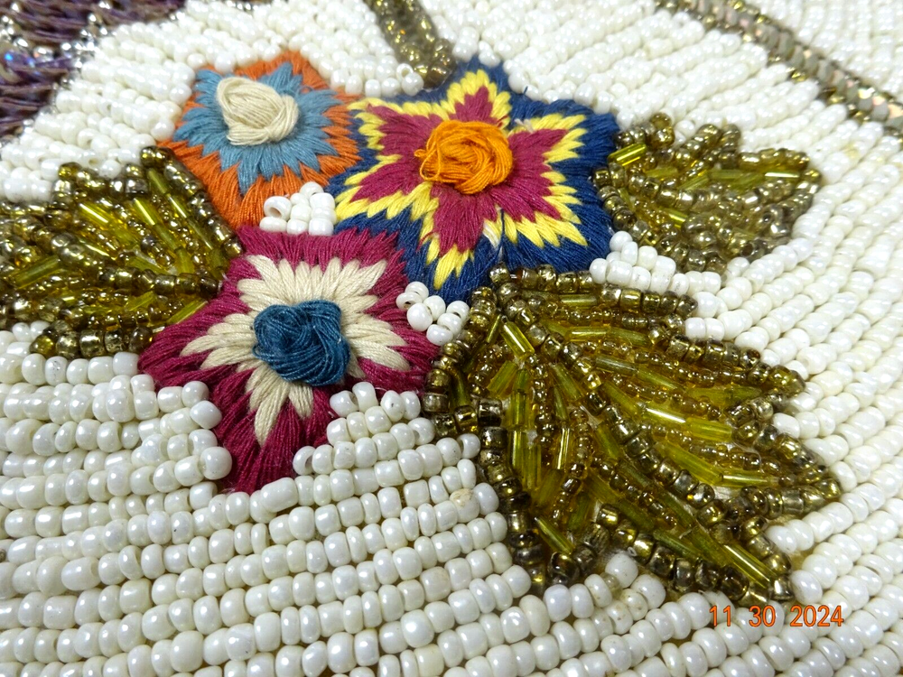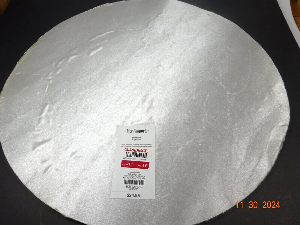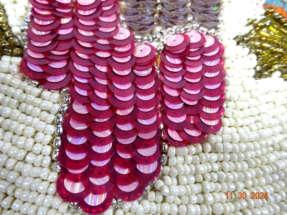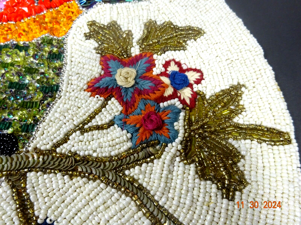 Beautiful Hand Stitched Pier One Material - beads , sequence cotton thread Measures - 15" Round Condition looks pretty good , on edge 1/4" 3 beads missing Not noticeable Shipping - I only charge the actual cost to your area. Thanks so much for looking. Have a nice day.