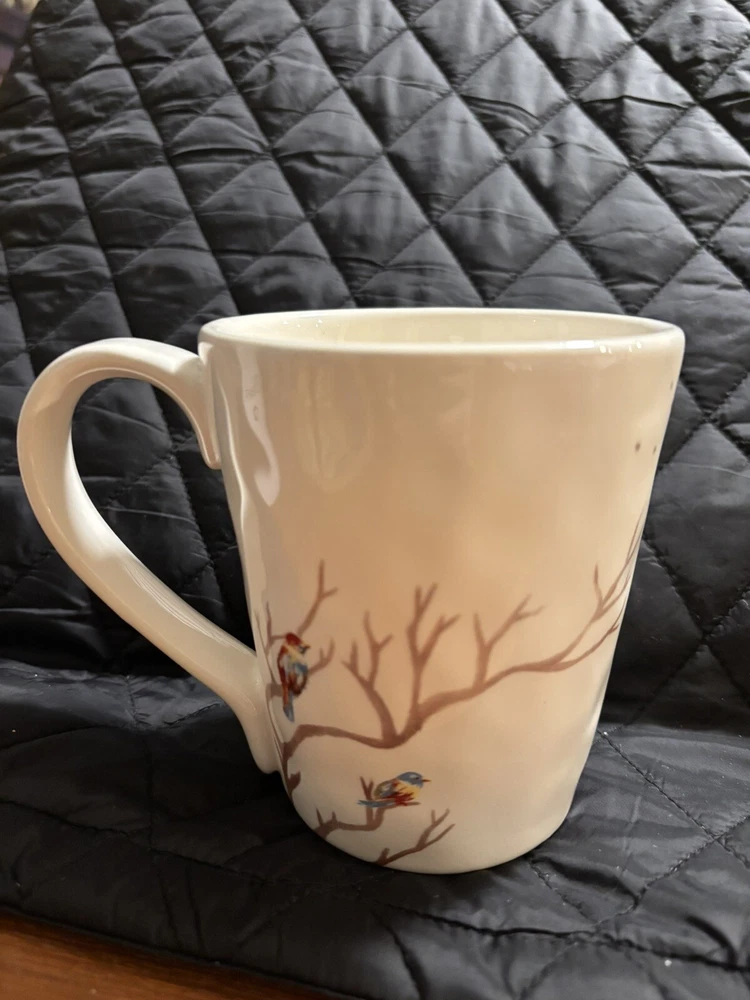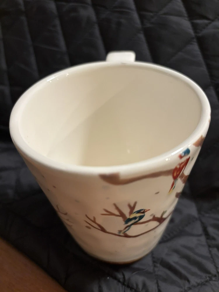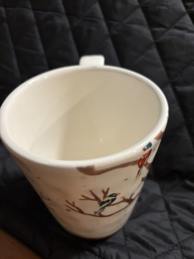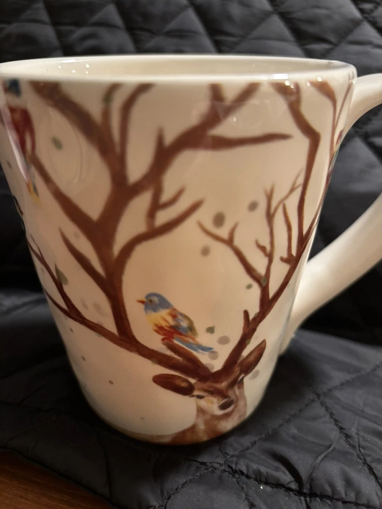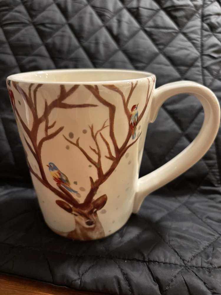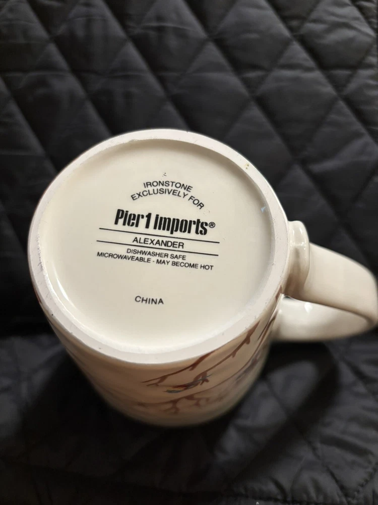 The product is a single coffee mug from Pier 1 made of ceramic material with a beige color. It features a design theme centered around animals, specifically deer and birds, with an Alexander design. The mug has a height of 4.5 inches, making it suitable for enjoying hot beverages like coffee or tea.