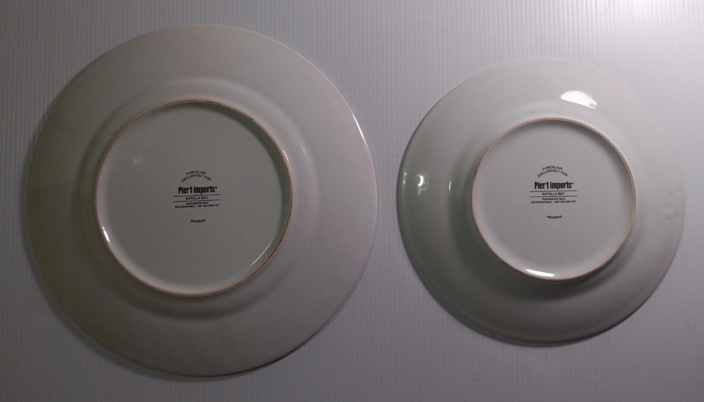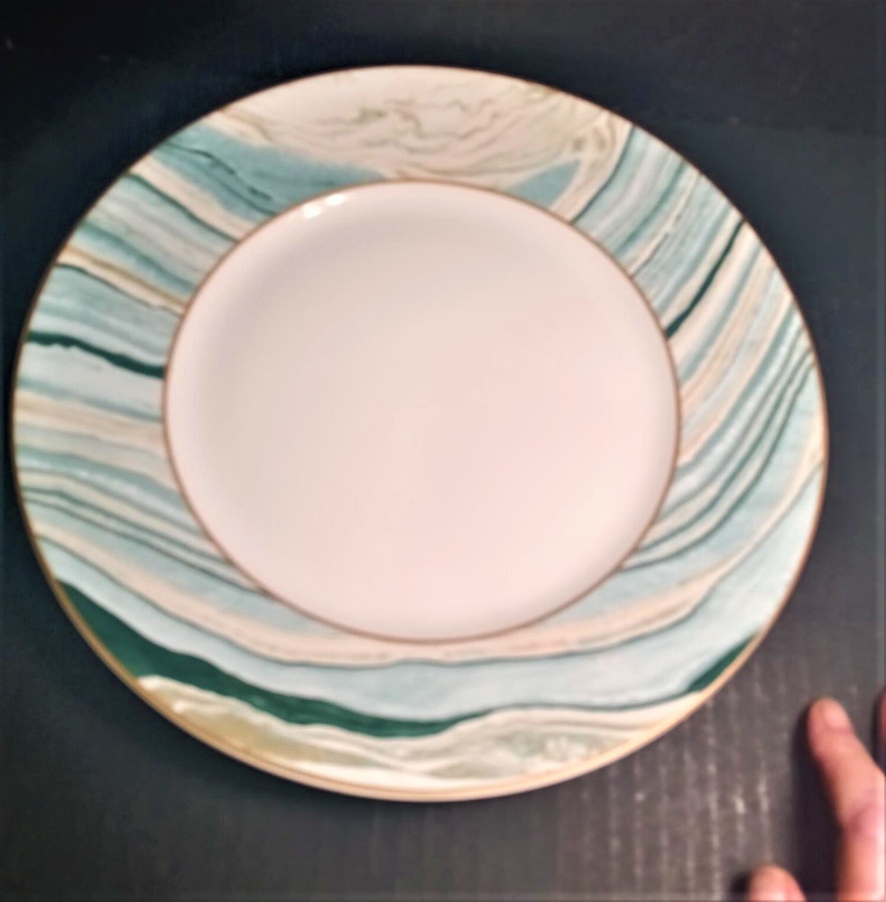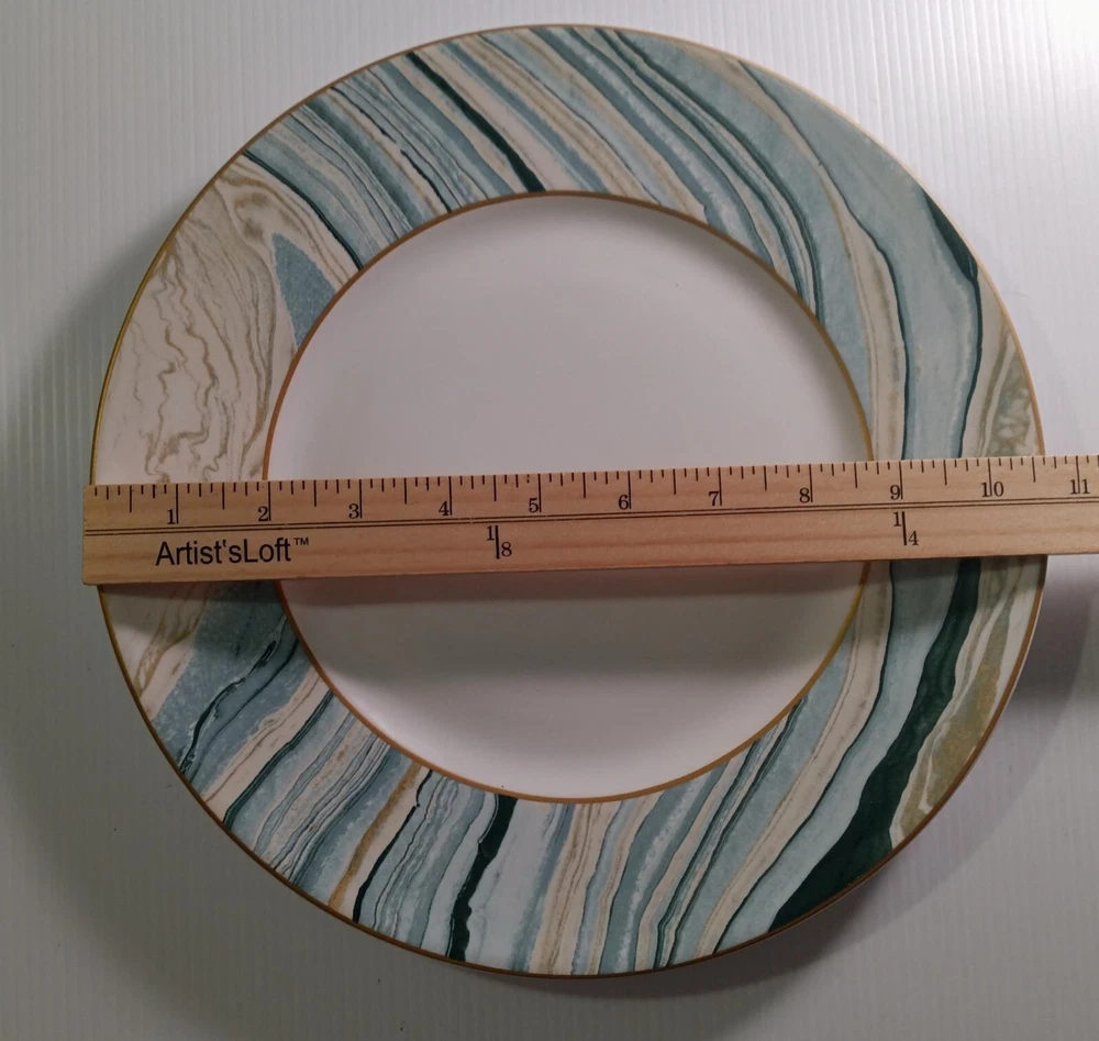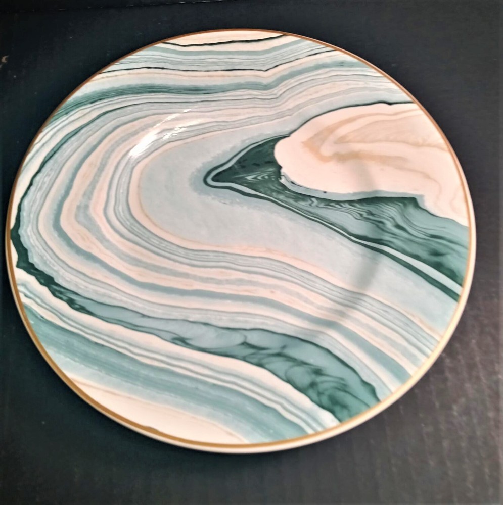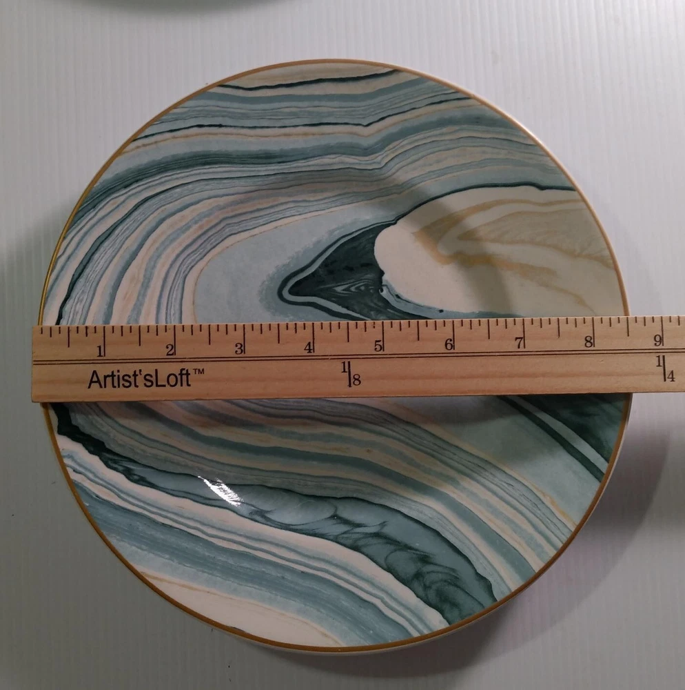 Pier One dinner Plate(10.75 inch) and salad Plate(8 inch)-one of each-in good preowned condition. Porcelain. Salad plate has overall marble swirl and dinner plate has marble swirl around the edge with white center. These plates are a mixture of aqua, gold and white. Very nice. If you have a question please ask. We will respond quickly and we ship promptly using as much recycled wrapping as possible. Thank you kindly.