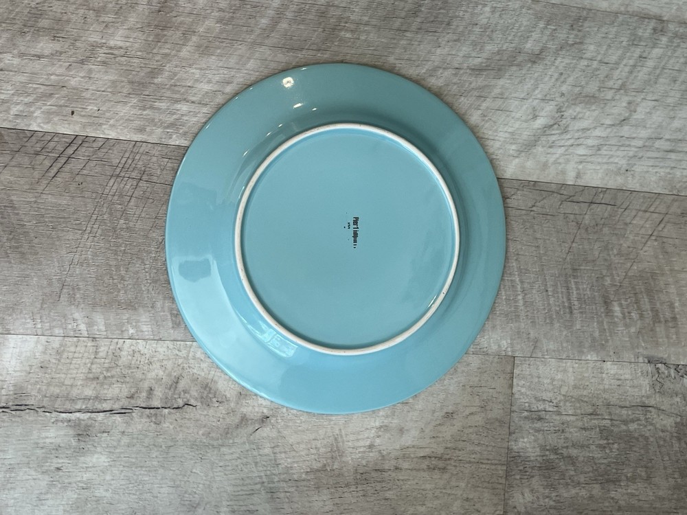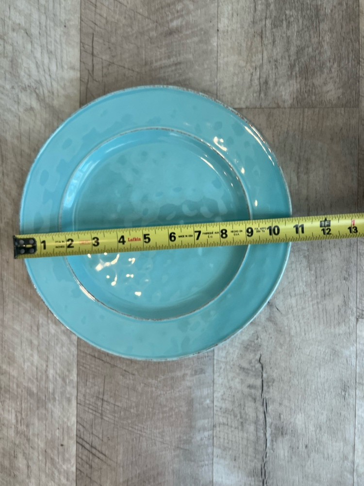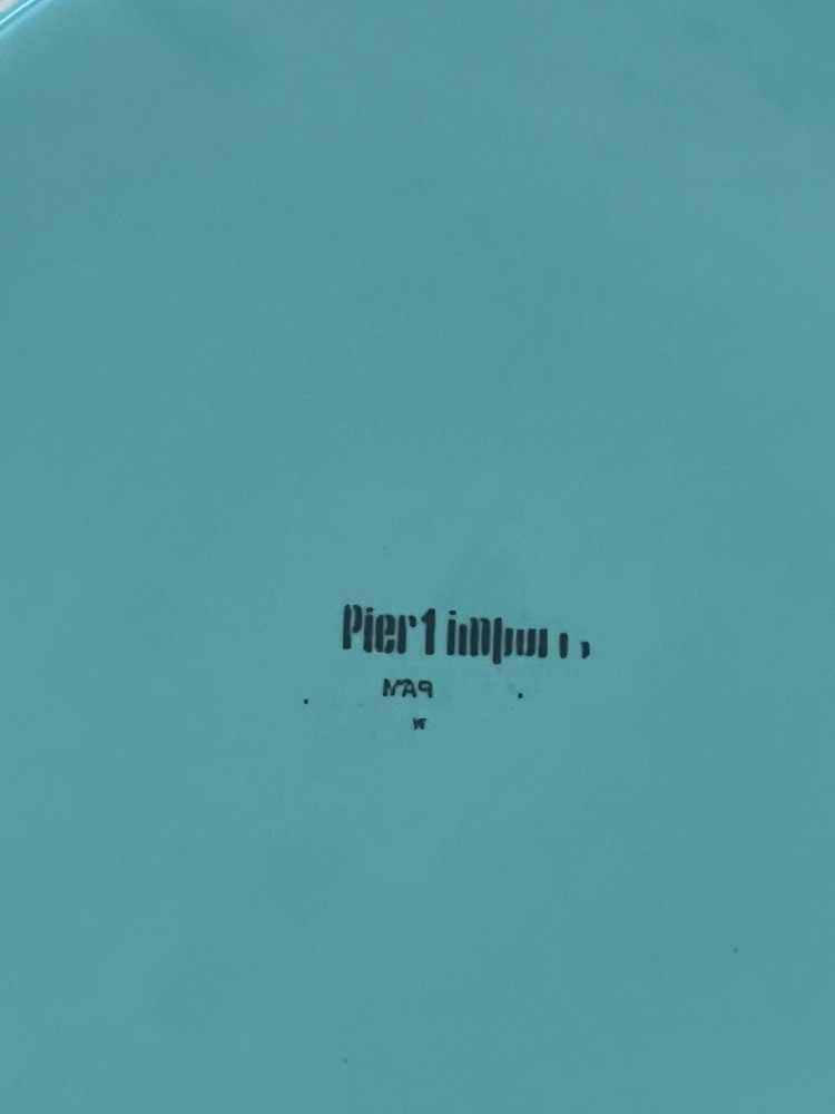 Add a touch of elegance to your dinner table with this set of two Pier 1 Imports Martillo Mint round dinner plates. The plates have a diameter of 10.75 inches and are made of sturdy stoneware. The Robin Egg Blue color and decorative pattern make them a perfect addition to any dinnerware collection. These plates are not only beautiful but also practical - they are microwave and dishwasher safe. The glossy finish and production technique used to make them are indicative of 21st-century pottery. Each plate weighs 2 lbs and has a printed backstamp. Make a statement with these unique and functional plates that are sure to impress your guests.