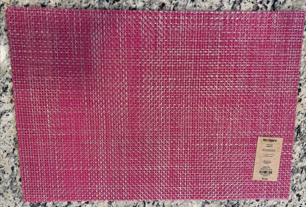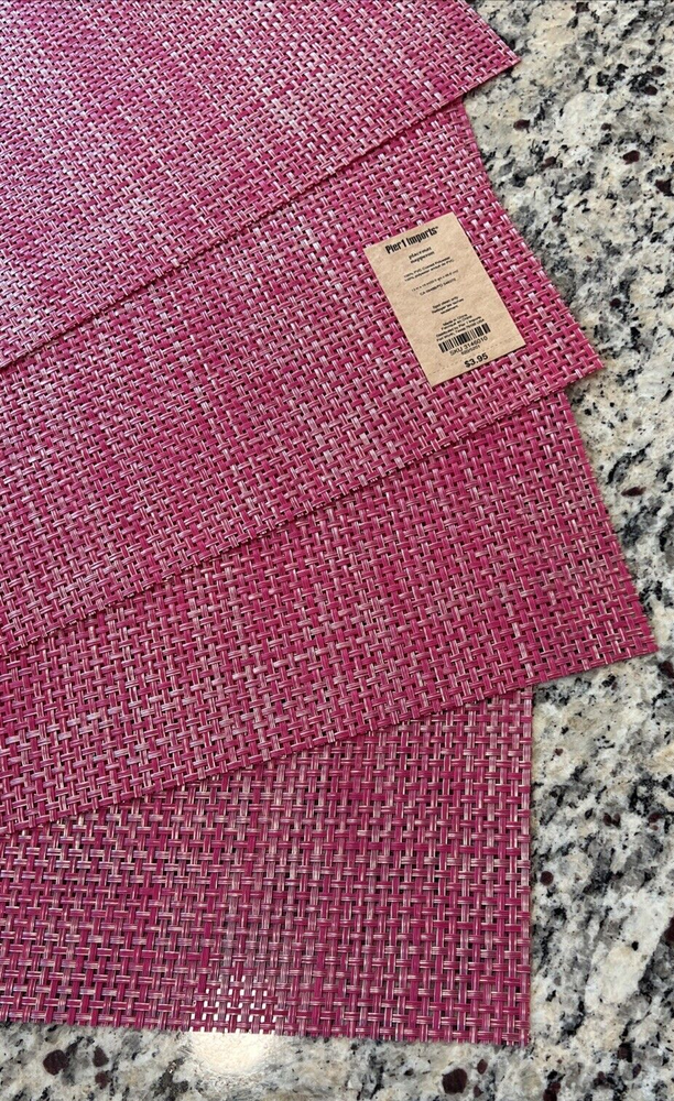 Charming Pier 1 Pink with touch of silver placemat. Set of 4 Measures 19 x 13 inches with a stylish woven design in pink and silver. Made from a durable polyester blend and PVC material, these placemats feature a woven pattern. Perfect for parties or everyday use Pre-owned in excellent never actually used condition - so (NOS)! Ships USPS