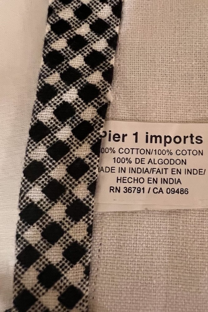 This is a set of 4 Pier 1 placemats in a black and white check border design with a coffee parlor French theme. The placemats are rectangular in shape and made of 100% cotton. They are machine washable and were manufactured in India. Perfect for adding a stylish touch to your dining table while enjoying a coffee-inspired theme.