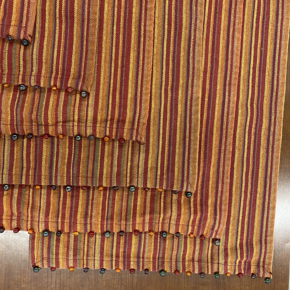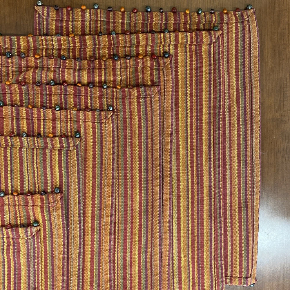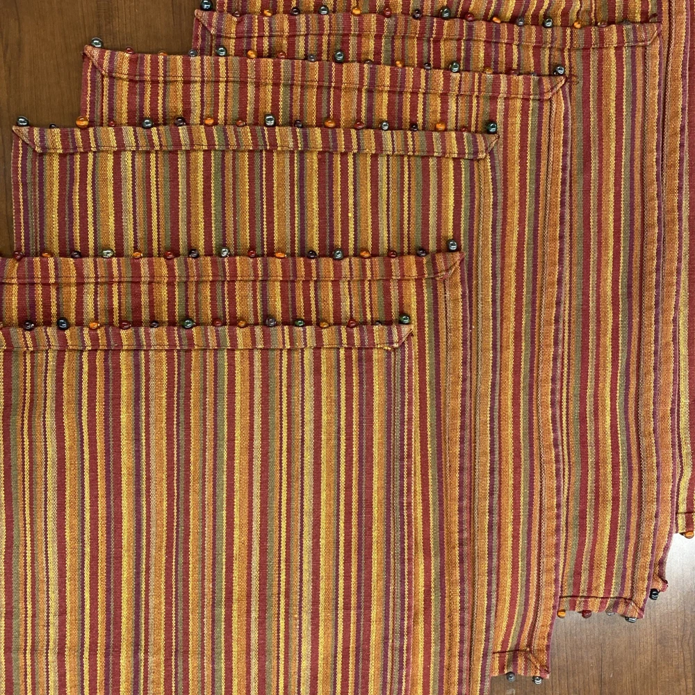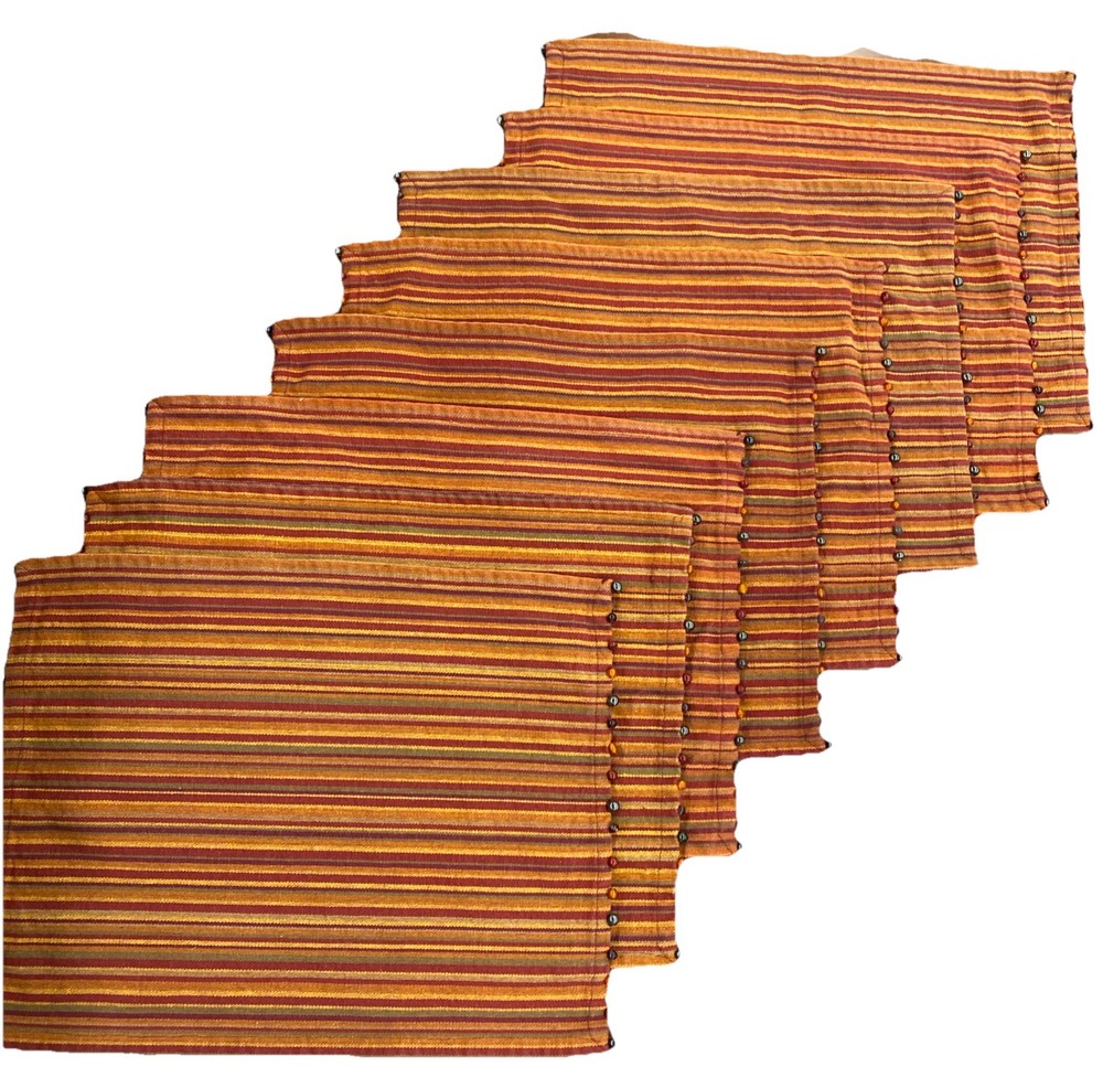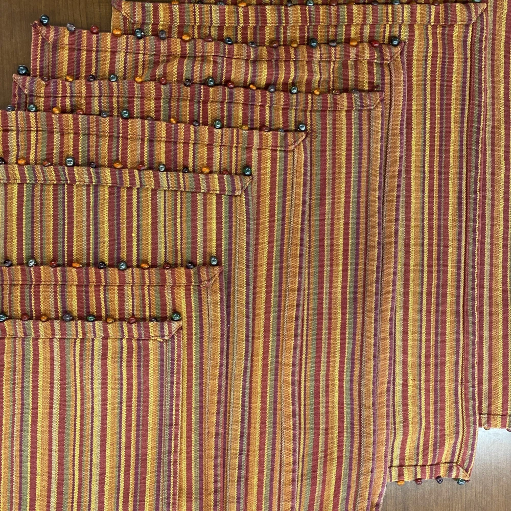 The Pier One Placemats Set of 8 in Fall Colors with Bead Accent Spicey Striped design is a perfect addition to your dining table. Made from 100% cotton, these rectangle-shaped placemats feature a multicolor striped pattern with added bead accents, adding a touch of elegance to your kitchen decor. Ideal for fall-themed occasions, this set is versatile and can be used for various purposes, making meal times more festive and stylish. ONE MAT IS MISSING ONE BEAD - see picture