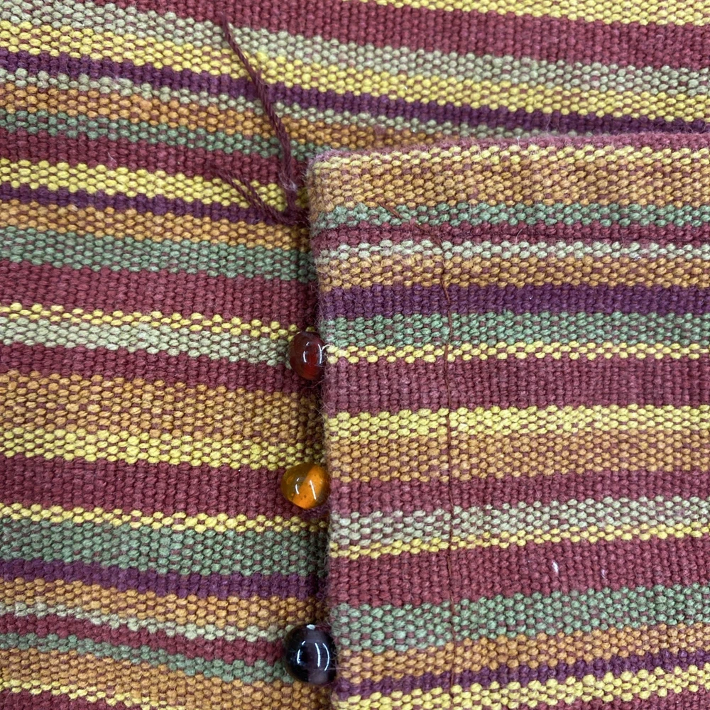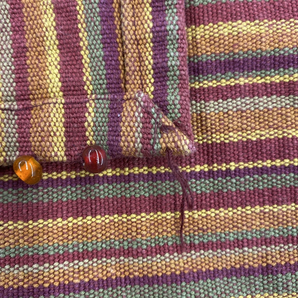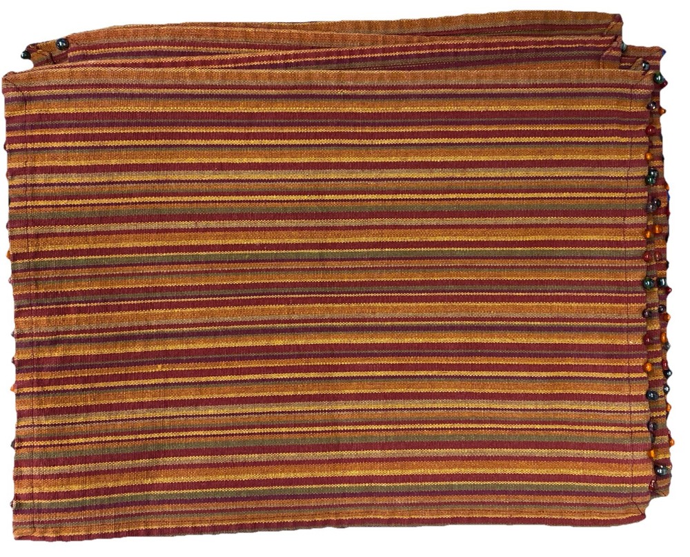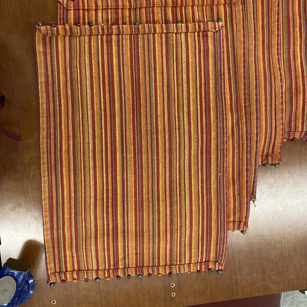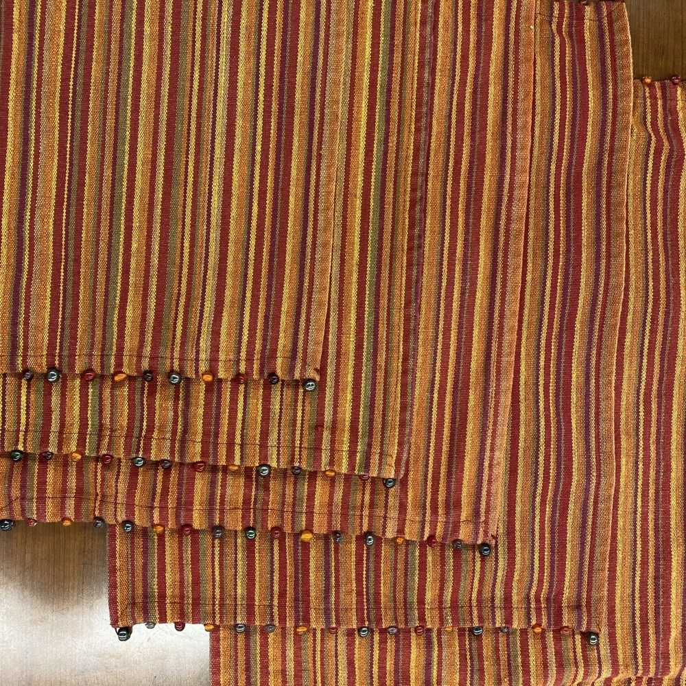 The Pier One Placemats Set of 8 in Fall Colors with Bead Accent Spicey Striped design is a perfect addition to your dining table. Made from 100% cotton, these rectangle-shaped placemats feature a multicolor striped pattern with added bead accents, adding a touch of elegance to your kitchen decor. Ideal for fall-themed occasions, this set is versatile and can be used for various purposes, making meal times more festive and stylish. ONE MAT IS MISSING ONE BEAD - see picture