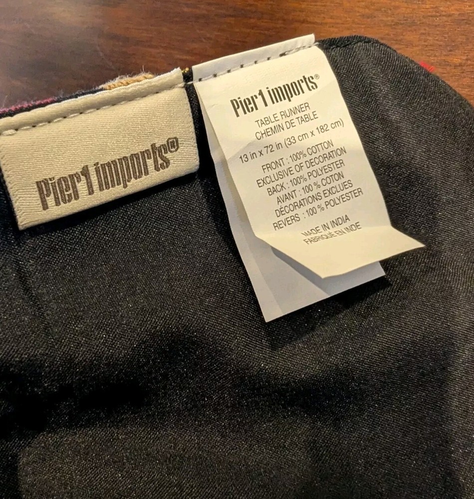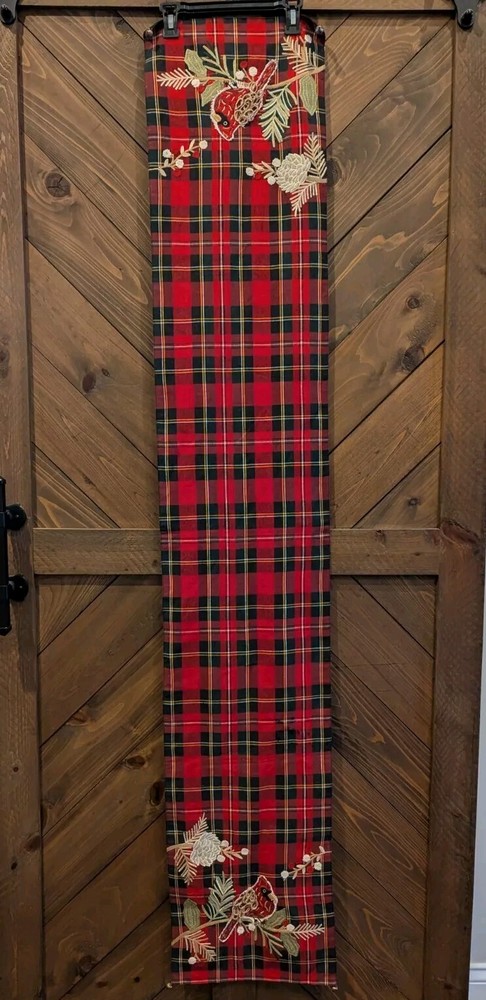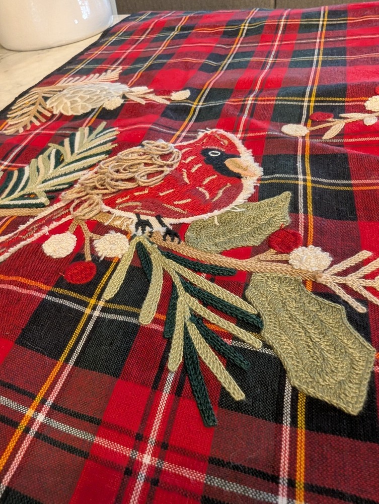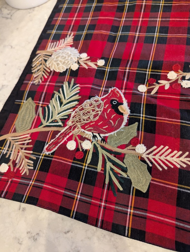 Add a touch of classic holiday charm to your home with this Pier 1 red and black plaid table runner. The runner measures 13” x 72” and is made of high-quality cotton material that is perfect for the winter season. It features beautiful cardinal appliques that add a unique touch to the design. This table runner is perfect for Christmas, parties, or any special occasion. Its rectangular shape and size make it a great fit for most tables. It is also a great addition to any home decor style, especially those that are designed with a classic or holiday theme. Get this multifunctional table runner today and add a touch of elegance to your home.