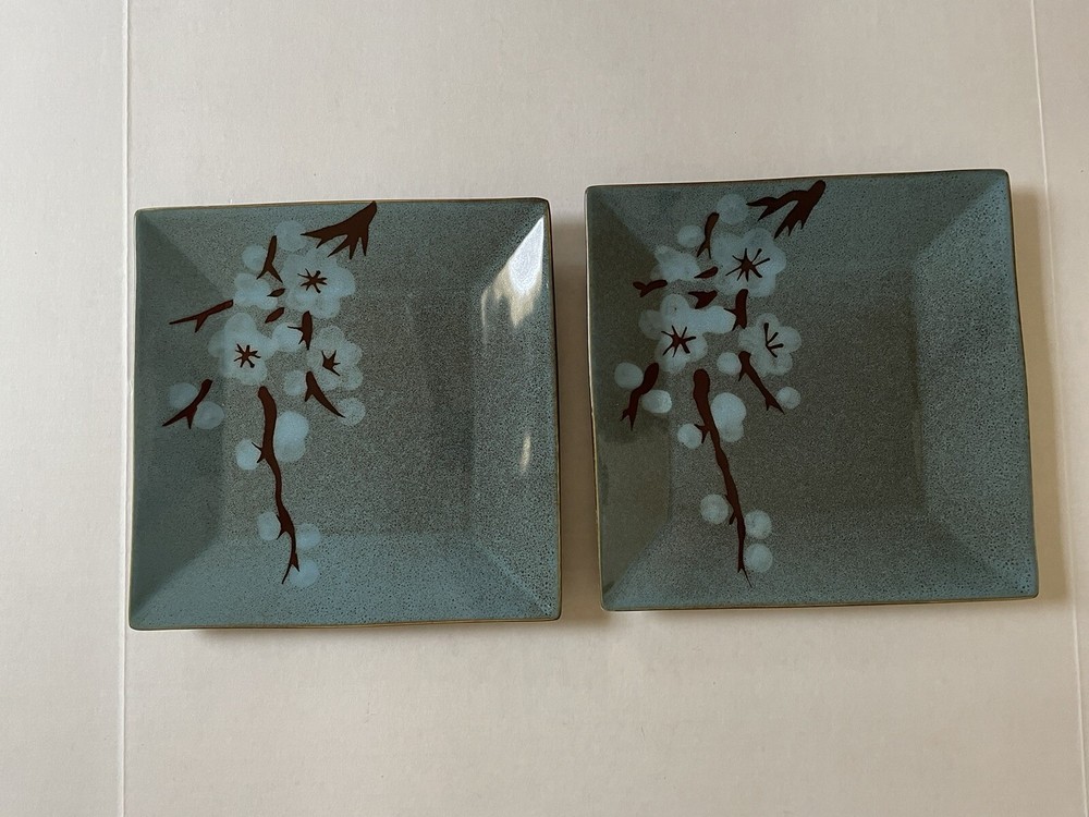 Add a touch of elegance to your dining table or displayed on your mantle with this beautiful Pier One Square Decorative Plate. The plate features a lovely floral pattern with green speckled hand-painted cotton blossoms, making it a perfect addition to any occasion. This contemporary original stoneware plate is part of the Tranquil product line and has a square shape. Crafted using earthenware production technique in China, this dinner plate is not only decorative but also durable. The plate is suitable for all occasions and will make a great addition to your collection. The Tranquil model, with its post-war design style, is perfect for those who love flower-themed decor. This plate is a must-have for anyone who wants to add a touch of sophistication to their dining experience. Item include two nearly identical plates.
