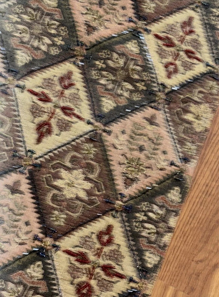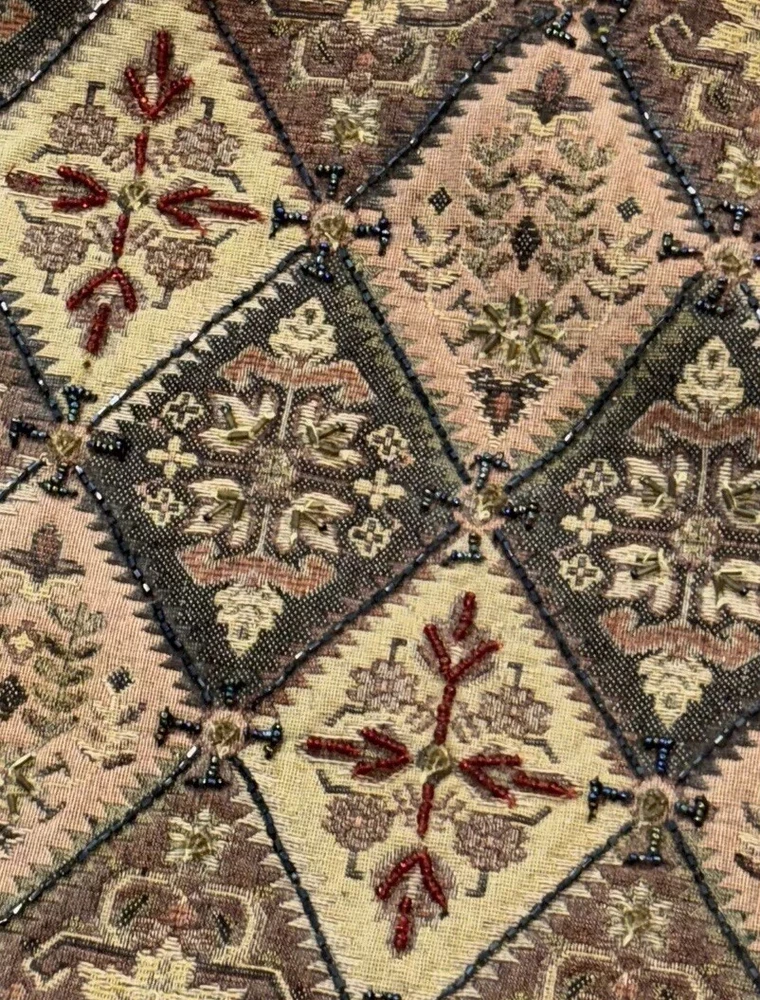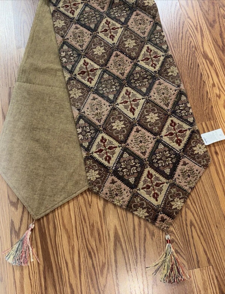 Add a touch of elegance to your dining table with this beautiful beaded table runner from Pier 1. The brown earthtones and diagonal pattern make it a perfect addition to any occasion, whether it's Christmas, party, or multipurpose. Made of a cotton blend material, this table runner is durable and soft to the touch. The 94" length with tassel and 14" width provide ample coverage for your table. The geometric pattern and beaded features add a unique touch that is sure to impress your guests. Made in India, this table runner is a great addition to any home decor. Beautiful heavy beaded table runner real statement piece with the glitter in excellent condition 14” x 72” does not include the length of the tassel BU 4