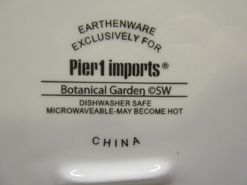 This is a beautiful pattern by Pier1 Imports. Manufactured from 2017-2018 this pattern is called Botanical Gardens and has beautifully colored flowers on a light green background and tan trim. For sale is a dinner plate that measures 11 1/8" and is in excellent used condition. There are a total of 8 dinner plates and I have other pieces of this pattern for sale in separate listings. 3/7/21 L