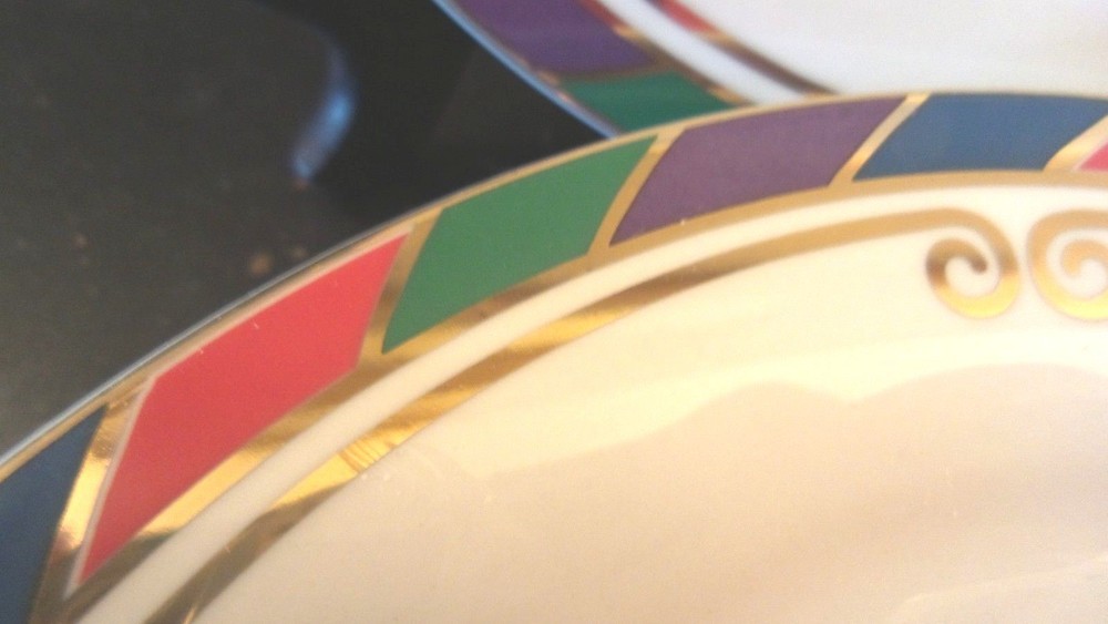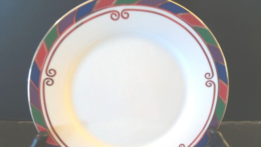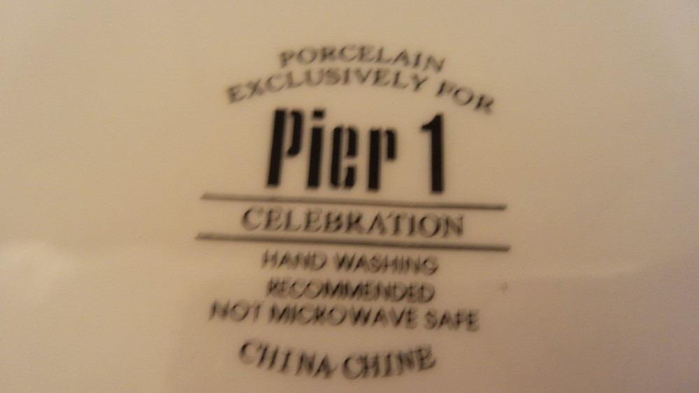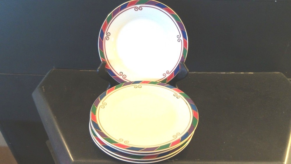 These dishes by Pier 1 are beautiful! Perfect for a Christmas celebration and the name of the pattern is Celebration. The rim has red,green and blue stripes and there is a gold scroll intertwined as well. For auction is a set of 5 salad/dessert plates . They are all in excellent used condition. Great set! 10/10/15 J #3