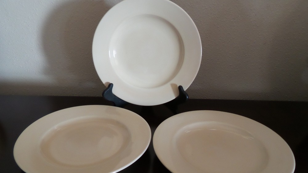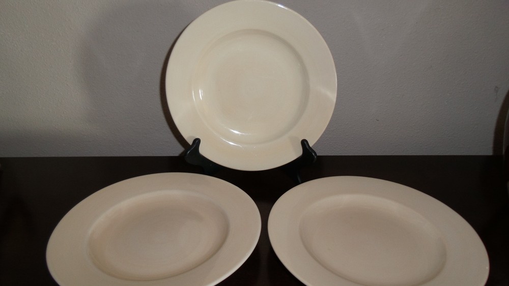 This is a great set of 3 Pier1 dinner plates in the Essential Colors pattern. These plates are Ivory and were manufactured from 2008-2012. They have since been discontinued. They measure 11" and are in excellent used condition.