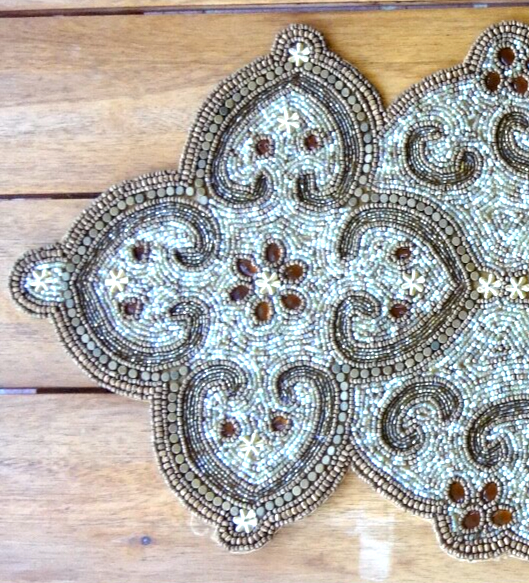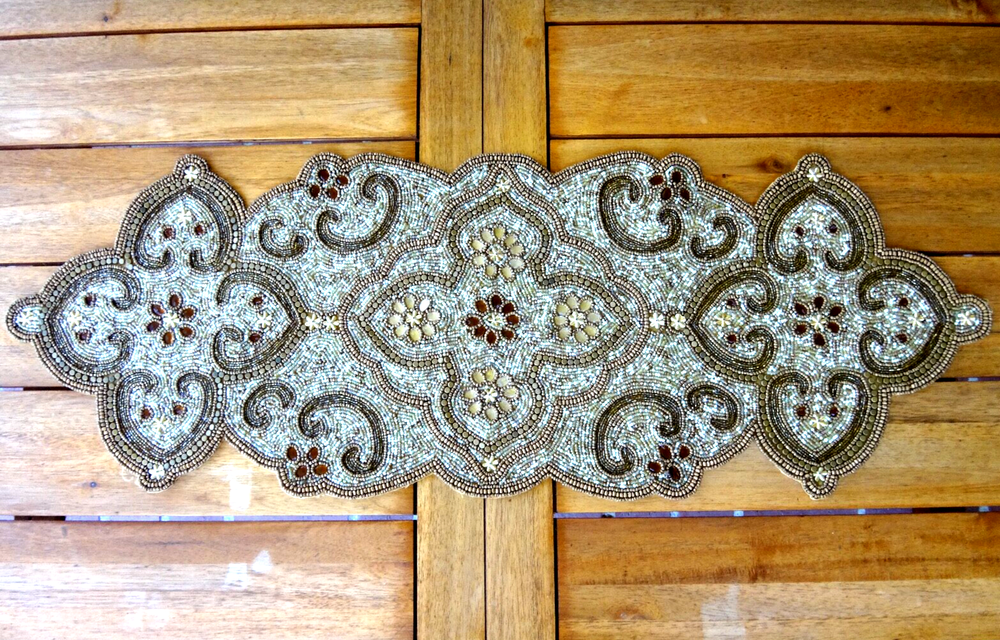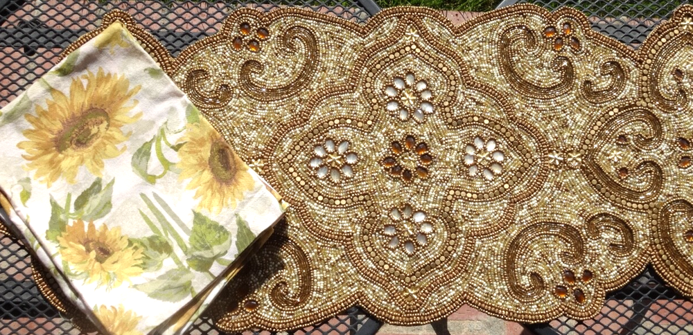 PIER1 HEAVY GOLDTONE BEADED 36" x 12" TABLE RUNNER. The pre-owned ~still has original store tag ~ Pier1, very heavy, gold tone beaded & rhinestone 36"L x 12"W table runner in very good condition, no missing beadwork, discoloration or damage. NOTE: the first 2 pictures were taken outdoors in the sunlight & the last 4 were taken in the shade. Also, not included & see separate listing for Pottery Barn Sunflower napkins. USPS Ground Advantage or USPS Priority Mail 2 Lbs. 3 Oz. Seller feedback provided upon payment, shipment & receipt of merchandise. Buyer feedback greatly appreciated. Thank you. Seller ships within 24 hours. Also, sometimes during shipping, damage may occur, if so, please contact me immediately to resolve the issue.