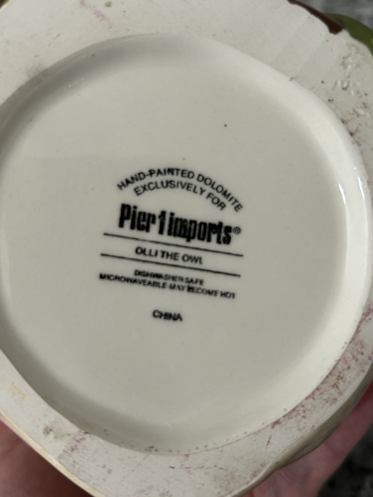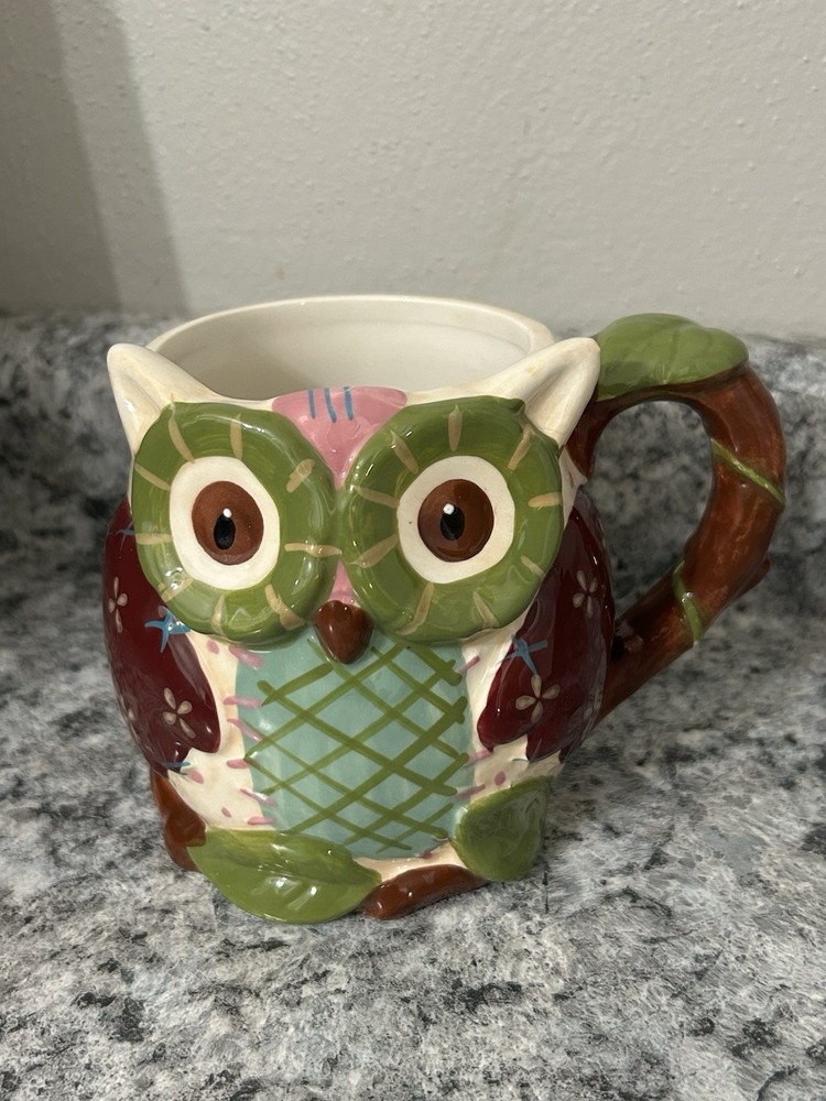 The Pier1 Imports Olli The Owl Large 3D Hand-Painted Mug is a unique and whimsical coffee mug with a capacity of 16 oz. It features a hand-painted 3D design of an owl, making it a fun and colorful addition to any kitchen or home decor. This original and contemporary piece is suitable for both hot and cold beverages, and is ideal for all occasions. Made of dolomite, this large coffee mug is a handmade collectible that will surely brighten up your morning cup of joe.