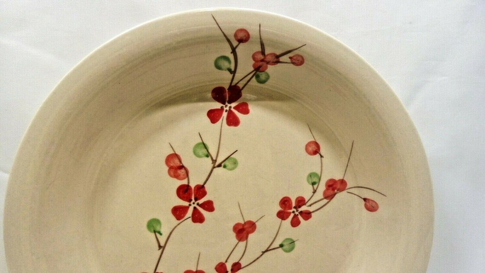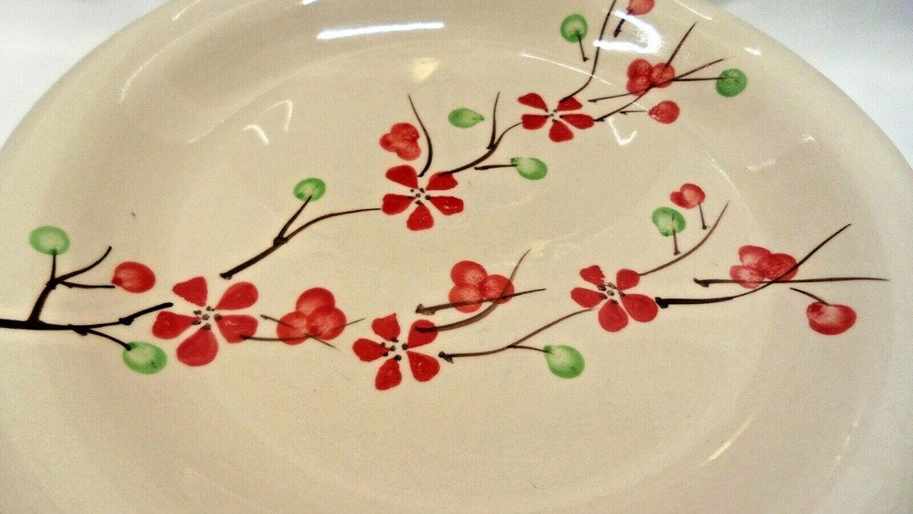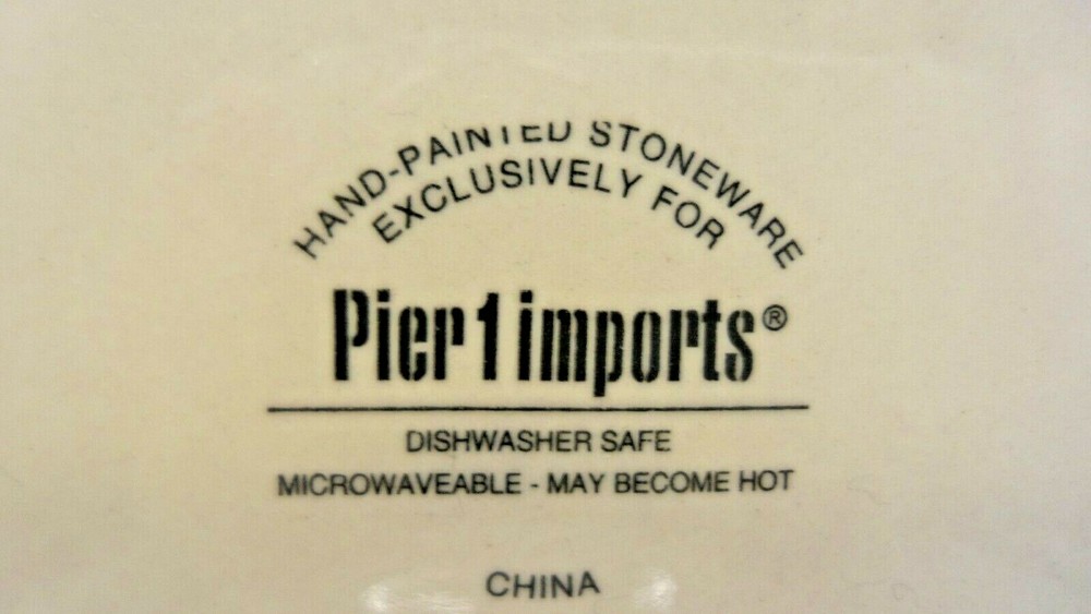 This a set of 4 dinner plates by Pier1 Imports. The pattern is known as PER180 and features a cream background with red flowers and berries on a branch. I do not know when this pattern was manufactured but it measures 10 1/2". These plates are in good used condition and have utensil marks. No chips or cracks. 4/11/19 J-B #1