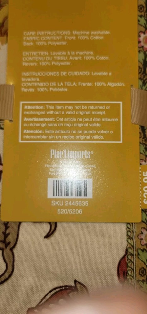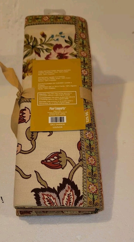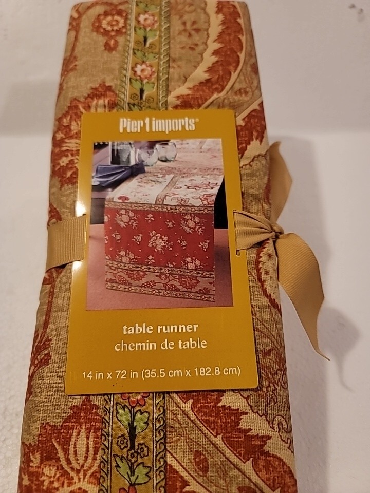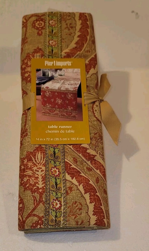This product is a Pier 1 table runner featuring a vintage floral pattern in red. It is a rectangular shape, measuring 14 inches in width and 72 inches in length. Made of a blend of cotton and polyester, it is machine washable up to 100°F. This multipurpose table runner from China adds a touch of elegance to your dining or living space.