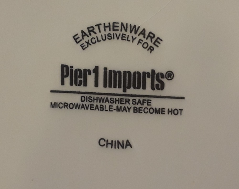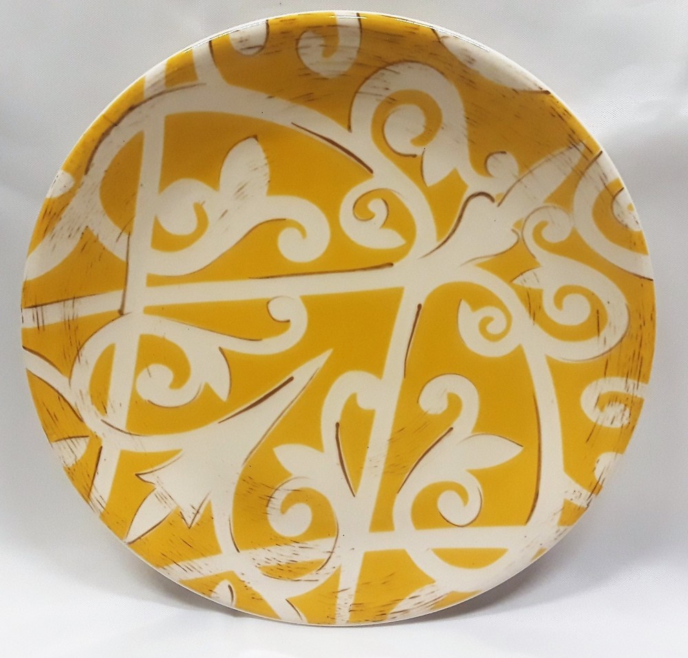 This is a really cool pattern by Pier1 Imports. I am unable to find the name of this pattern by it is yellow with white scrolls and brown highlights. This salad plate measures 8 1/4" and is in excellent used condition with some mild crazing on the bottom. 12/31/18 K-B #1